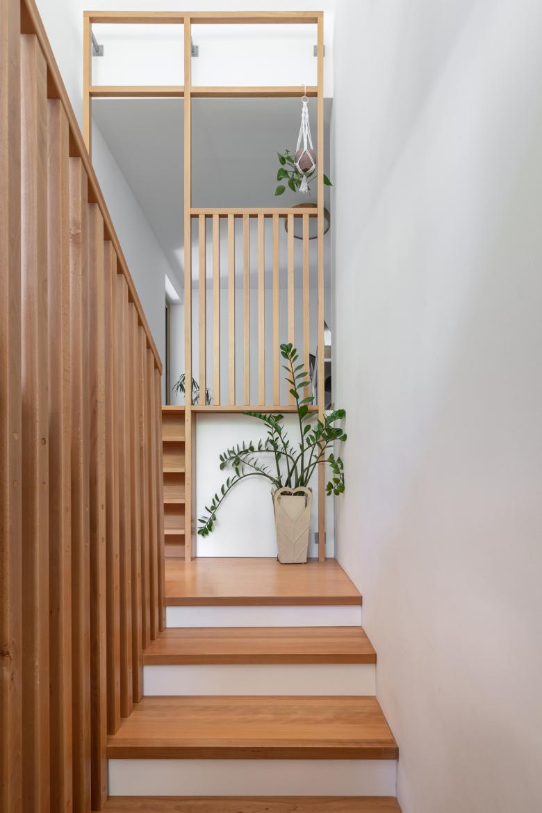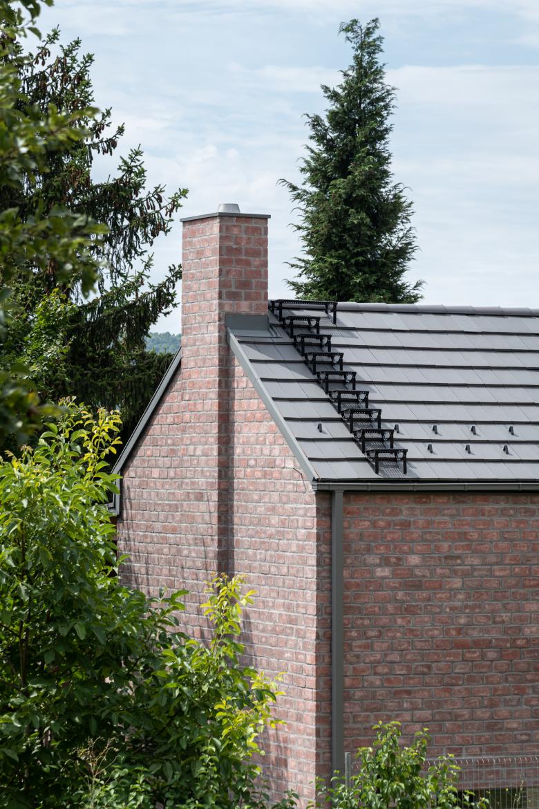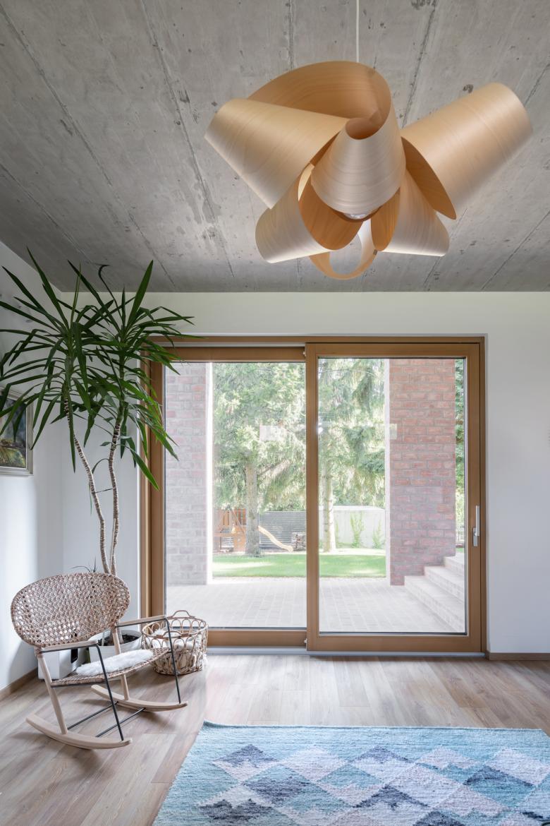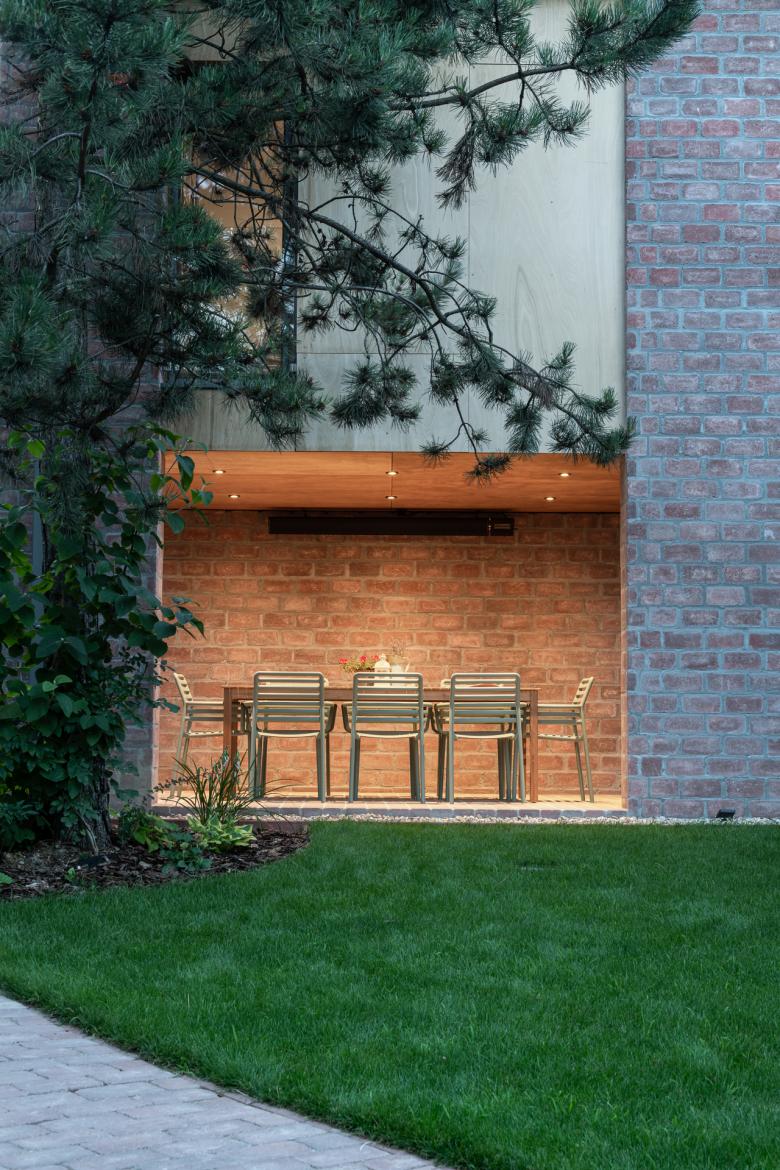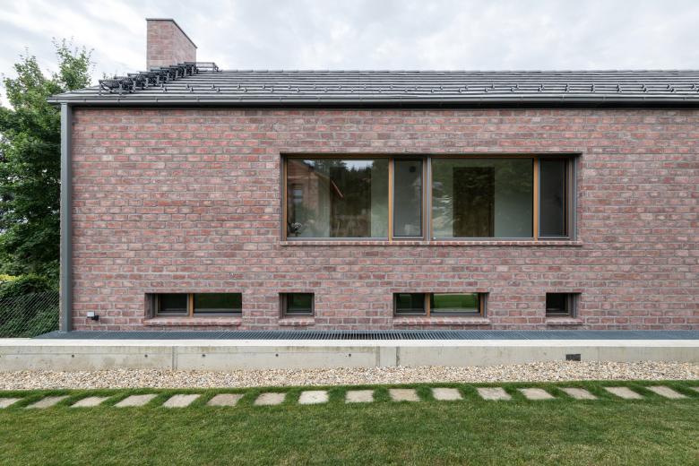The house stands on a sloping hillside scattered with pinetrees, in the town of Nagykovácsi. The main architectural element is the two-storey high semi-open porch attached to the southern side of the building. The five robust brick pillars of the porch stand in contrast with the floaty wooden boxes incorporating the balcony and the work-room seeming to levitate between them. The porch has an important role acting as a shading system thus contributing to a balanced indoor climate. Furthermore it offers ideal setting for outdoor family life all year long whether functioning as a playground for the kids or sheltering populous family gatherings.