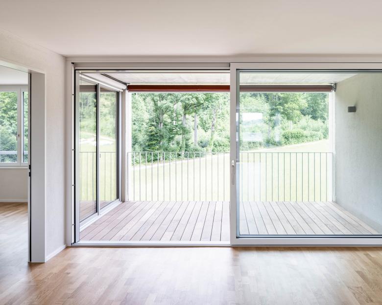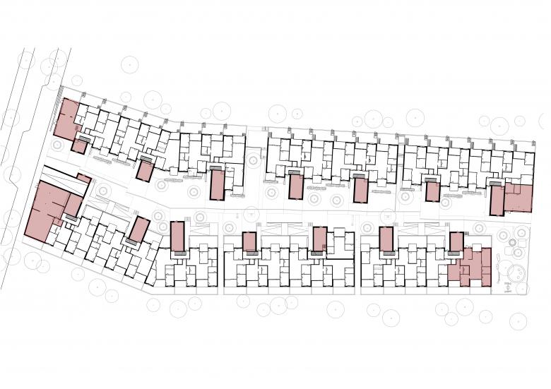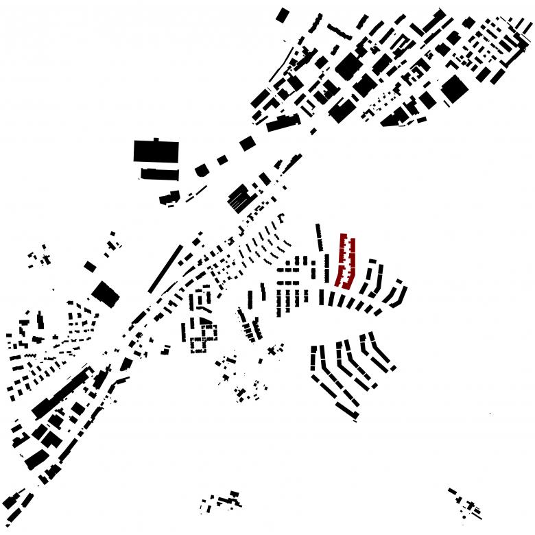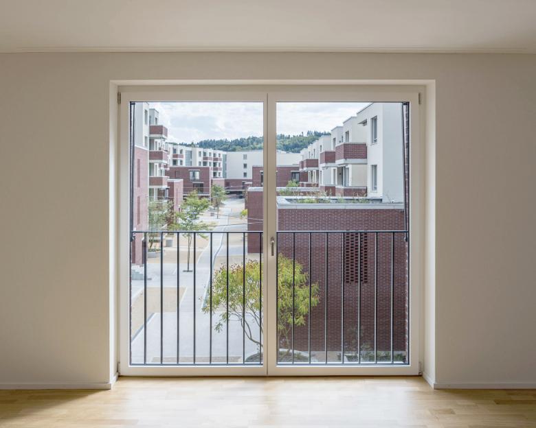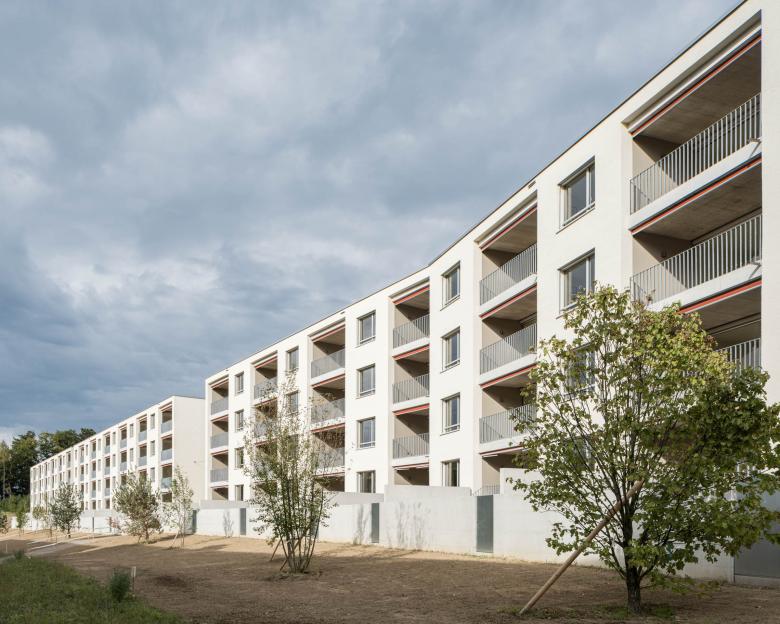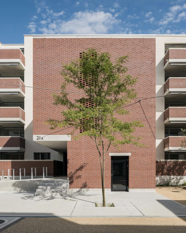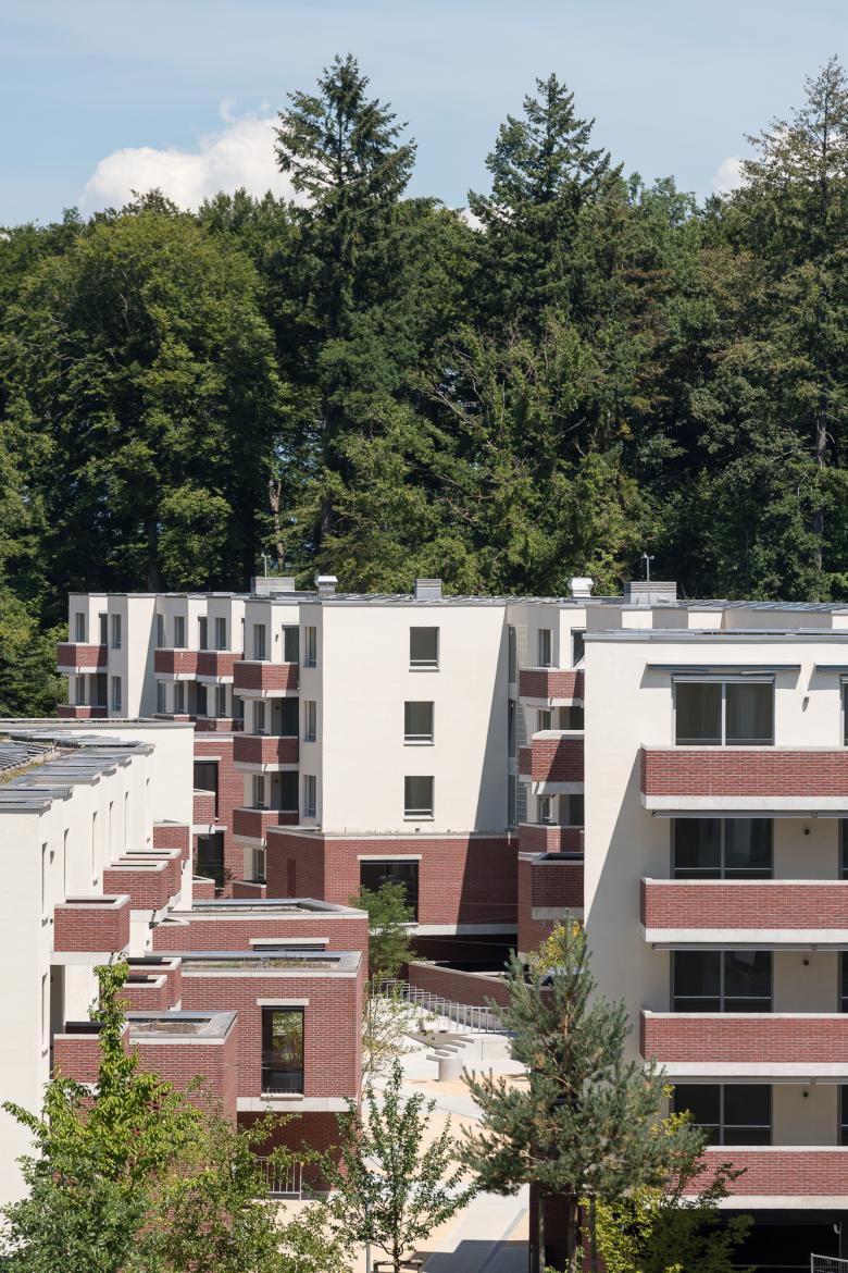 Der Siedlungsraum ist mit seinem langgezogenen und vielfach gegliederten Quartierhof eine veritable Nachbarschaftsmaschine. Alle architektonischen Elemente, die sich außerhalb der Gebäudekörper befinden und keine Wärmedämmung enthalten, sind aus Backstein gemauert. Dies erzeugt eine starke Identität und signalisiert eine hohe Wertschätzung des kollektiven Lebensraumes. In den langgestreckten, platzartigen Höfen kann sich das soziale Leben des Quartiers entfalten. Die vorspringenden Hofbauten enthalten Waschküche, Kinderwagenräume und Dachterrasse für das jeweilige Wohnhaus. Die Backsteinvolumen strukturieren den Siedlungsraum und schaffen klare Adressen. Die Ost-West-Orientierung ermöglicht Grundrisse mit durchgehenden Wohnbereichen, um sowohl von der weiten Landschaft, wie auch von der Qualität des Quartierhofes zu profitieren.