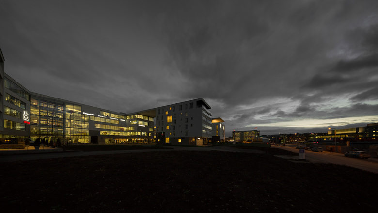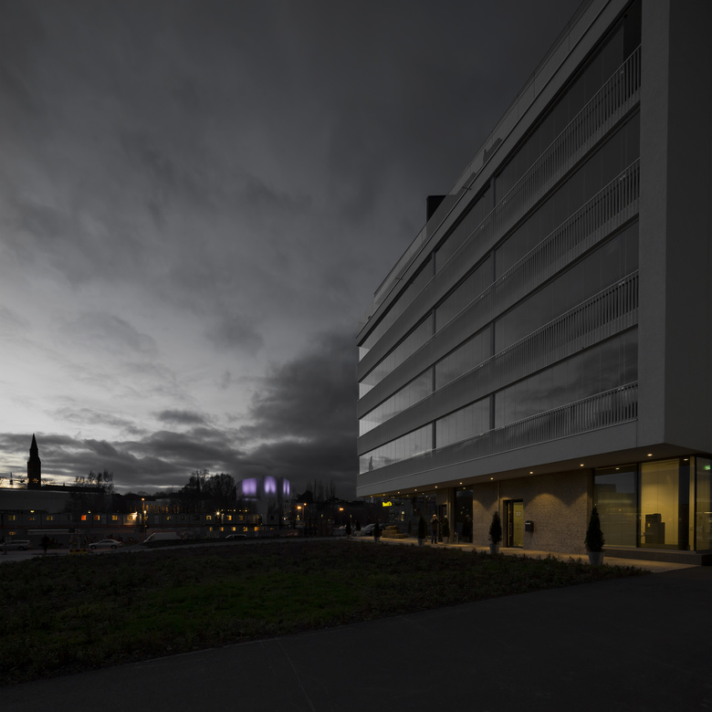 The design is based on the winning entry of the invitational competition held in 2010. The office building is connected to the two residential buildings on the other side of the road with a uniform canopy. The office building is located in Töölönlahti right in the green heart of Helsinki. The edifices surrounding the site define the projects architectural quality. It is situated among a group of prestigious buildings that form part of the national heritage. The Alma Media Headquarters is a key part of the Finlandia Park and of the unified building front bordering the railway.