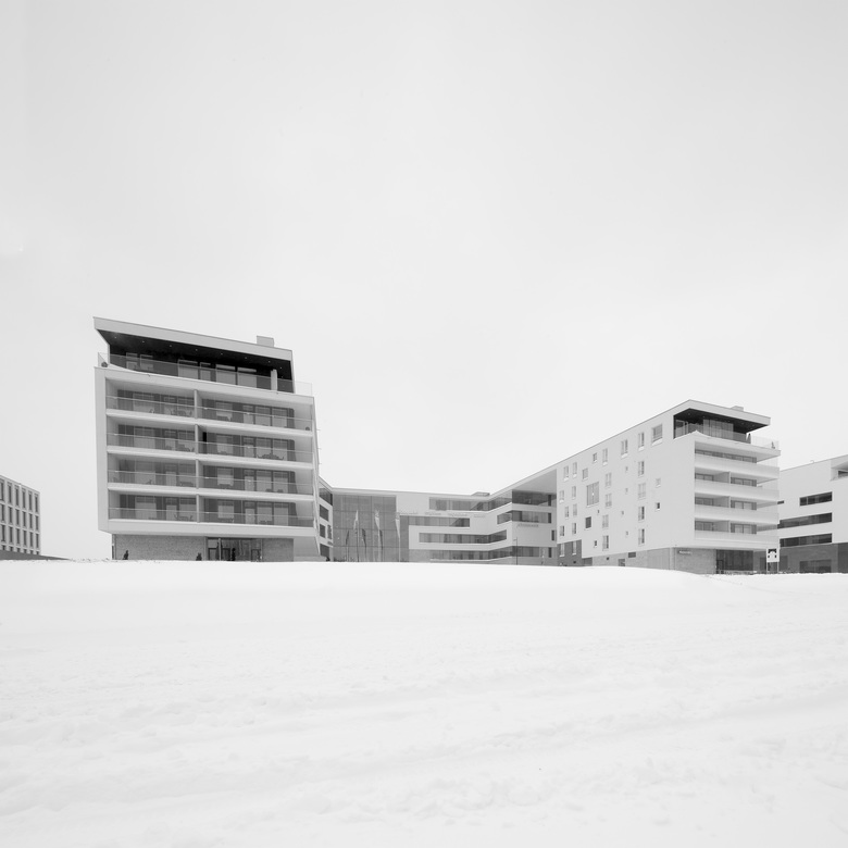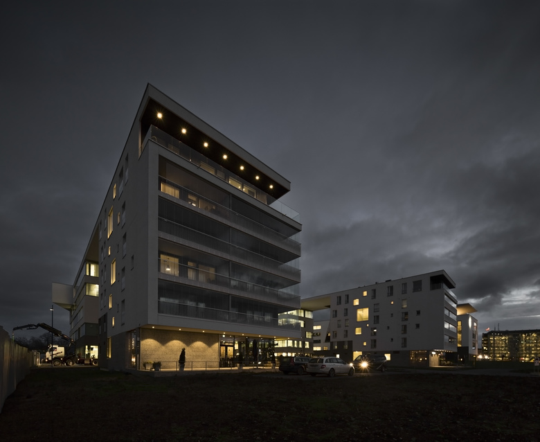 Each housing apartment has its own terrace connected to the living areas. The apartments have been carried out so that the structure and shafts remain uniform and aligned from bottom to top, resulting in wide views into the surrounding landscape. The first floor includes retail spaces which, upon completion of the park, may also act as cafeterias.The building is made out of reinforced concrete with a surface finish of light-coloured plaster. The building is implemented in sustainable, ecological and high-quality materials.