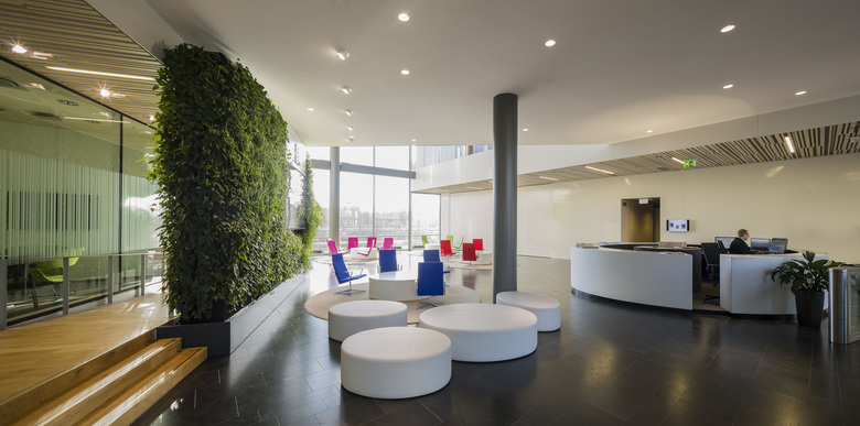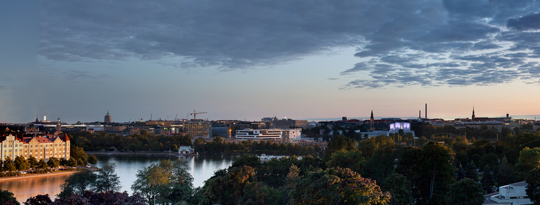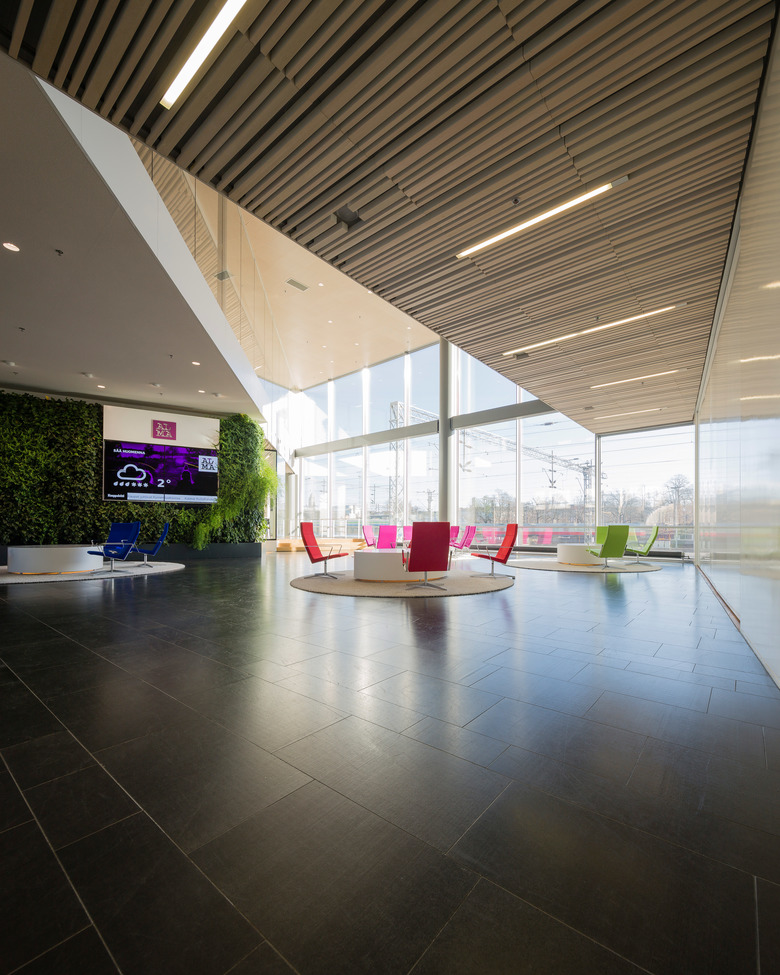 From the outside, the building is visible in the greater landscape while its interior opens onto beautiful views of Helsinki. The office building communicates the values of a renewable and responsible media house. Its urban and substantive aspects form a basis for the quiet classical architecture of the building. The composition of surfaces, openings and materials are modern and clear. The façades are white plaster, glass, natural stone and wood. Public areas are treated with fresh colours. The east façade facing the railway track forms a vivid and colourful media wall for tens of thousands of train passengers around the clock. The west façade of the building and its terraces interweave with the park landscape.