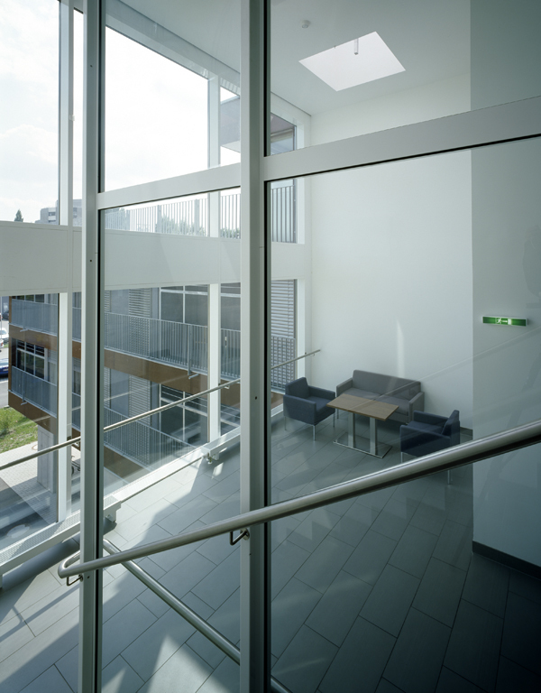 Der erweiterte, großzügig verglaste, Stiegenhausbereich dient neben dem Tagraum als Aufenthaltsbereich, der sich durch die visuelle Verbindung zum Hof ideal als Kommunikationsbereich eignet.
