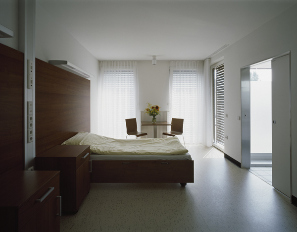 Im ersten und zweiten Obergeschoss befinden sich die beiden Stationen mit jeweils 16 Ein- und Zweibettzimmern, dem verglasten Tagraum, dem Stützpunkt sowie diverse Untersuchungs- und