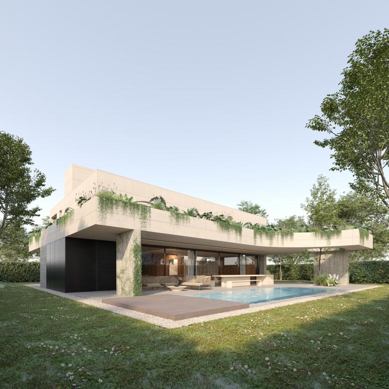 La zona notte, concentrata al secondo piano, offre ambienti più raccolti e intimi, con camere che godono di luce naturale e di viste dirette sul giardino. Al piano interrato, una palestra luminosa permette di allenarsi in un ambiente funzionale, grazie a un’apertura strategica che garantisce luce naturale e connessione con l’esterno. Il giardino e l’area esterna completano il progetto, con una piscina e spazi attrezzati per il relax, creando un continuum tra architettura e paesaggio.