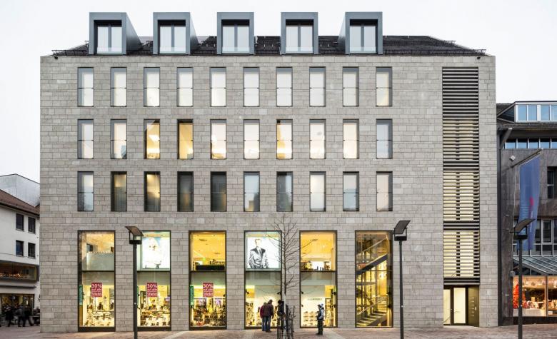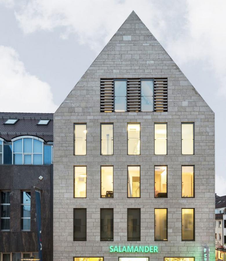 In der hoch frequentierten Ulmer Fußgängerzone, unweit des Ulmer Münsters, befindet sich unser Neubau eines Wohn- und Geschäftshauses. Mit der markanten Fassade aus Crailsheimer Muschelkalk haben wir ein Statement in der Hirschstraße gesetzt, das nicht nur Blickfang ist, sondern auch klare Formen in Natürlichkeit hüllt.
