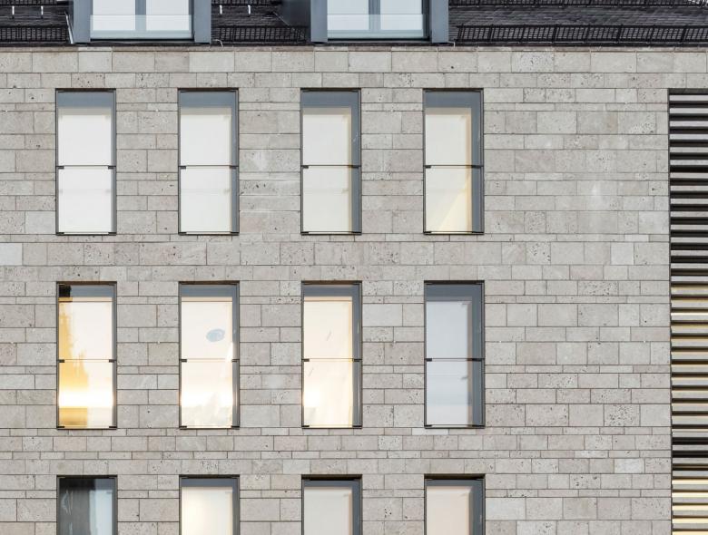 Ein Pendant zu diesen puren Glas- und Metallflächen setzt der Muschelkalk, der durch seine Einschlüsse und offenen Stellen lebendig wirkt. In einem spannenden Zusammenspiel dieser verschiedenen Oberflächen entsteht letztendlich eine homogene Fassadenfläche.