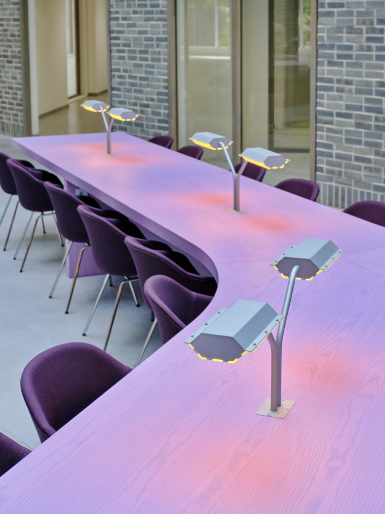 The interior design, in collaboration with Dutch Invertuals, creates a flexible route through zones for focus, informal meetings, and relaxed lounge areas. Carpet motifs refer to meadows, sky-blue curtains with cloud prints at the seating tiers evoke lightness, and tactile materials stimulate the senses. Throughout the interior, color plays a key role, with careful attention given to the interplay of material and hue.