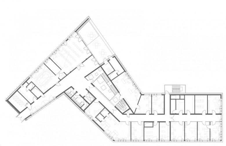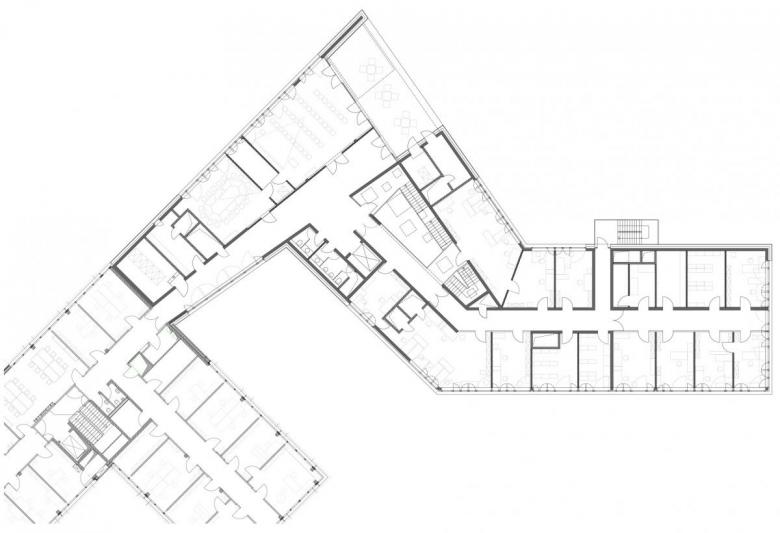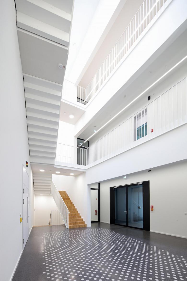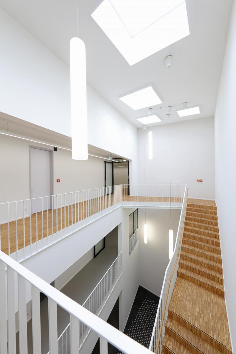 Das zentrale Treppenhaus als „Herz“ des Gebäudes bindet alle Ebenen offen zusammen und schafft durch verbindende Brücken und Stege eine helle Kommunikationszone.