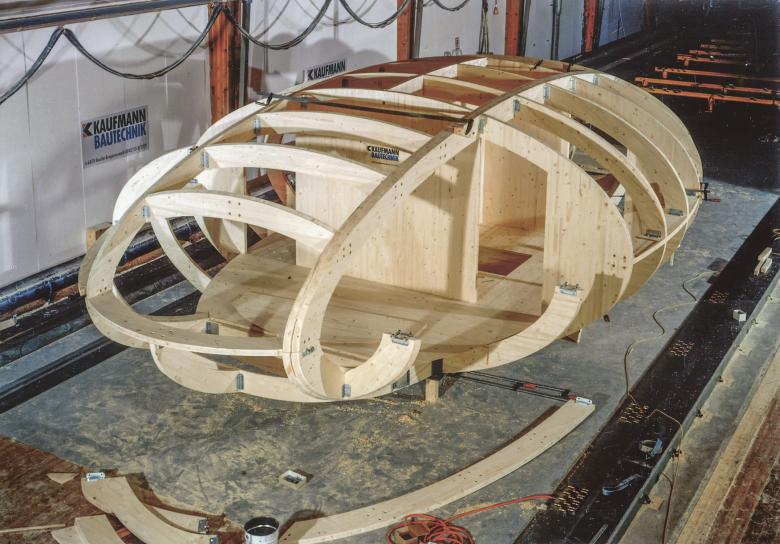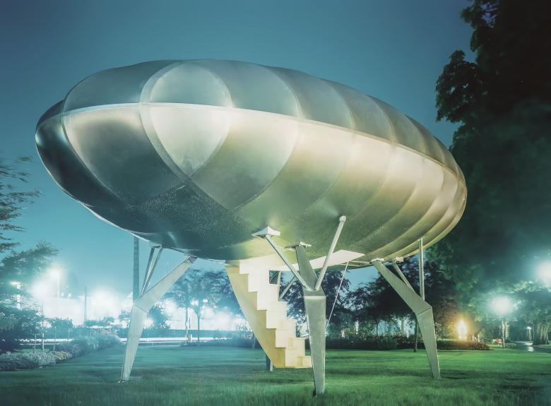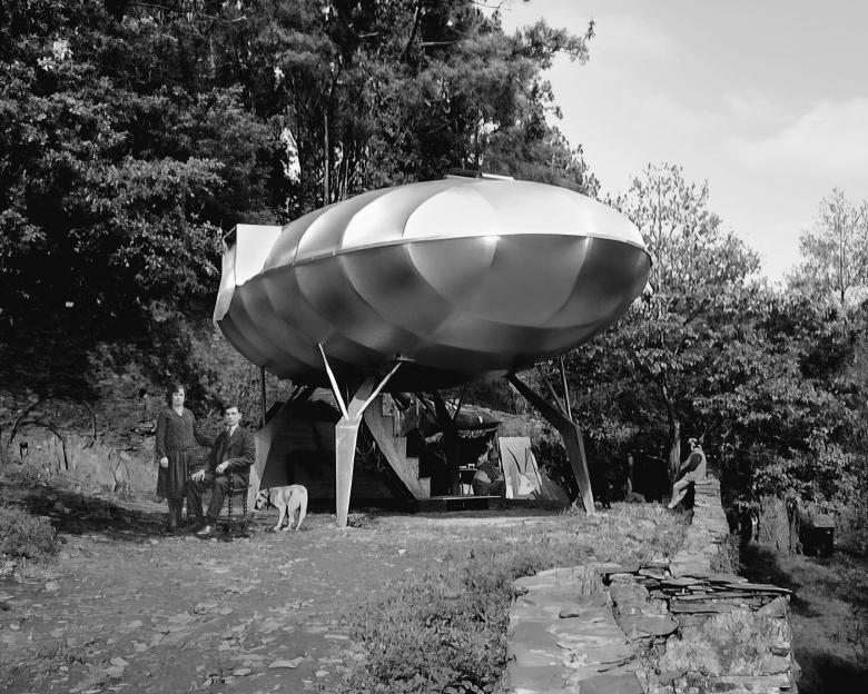 Der ellipsoide Baukörper besteht aus einem Holzstecksystem. Es ist leicht zusammensetzbar und steht wie der Hórreo auf hohen Pfeilern, um unerwünschten tierischen Besuchern den Zugang zu erschweren. Über eine herausklappbare Treppe lässt sich der Innenraum betreten. Im hochgezogenen Zustand verschliesst die Stiege den Eingang komplett und sorgt für ausreichend Privatsphäre und ein Gefühl der Sicherheit. Diese bewusste Isolation durch Entzug des Zugangs lässt das Raumschiff buchstäblich über dem Boden schweben. Der Schwebezustand der Struktur schafft zugleich optimale Bedingungen fürs Schlafen und Träumen.