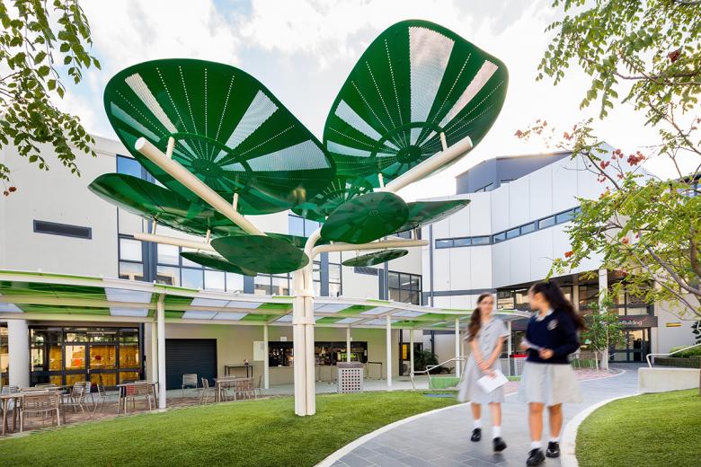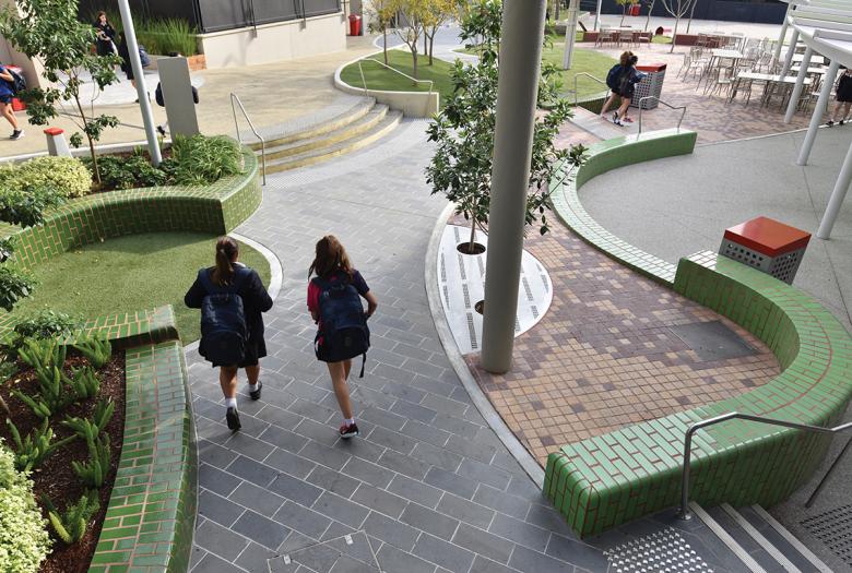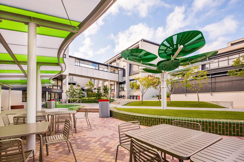 The key elements of this courtyard included an active outdoor auditorium for conducting engaging group activities, green banks to complement the sports court, a piazza influenced flexible use space, a new light and bright shade canopy, a contemporary representation of a shade providing tree and extensive but subtle night lighting.