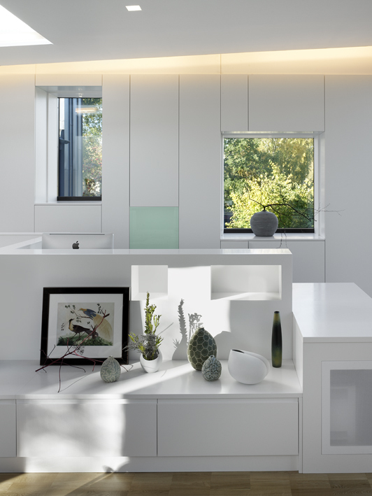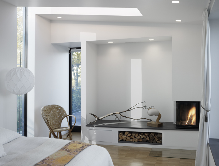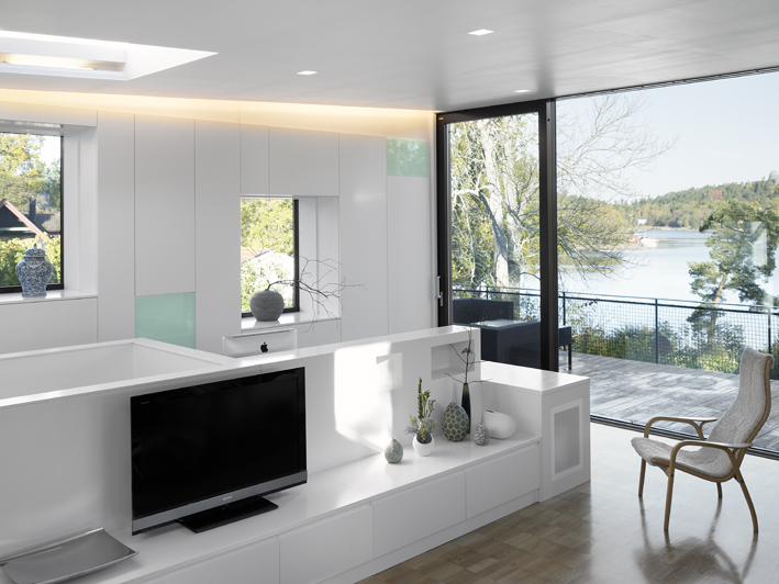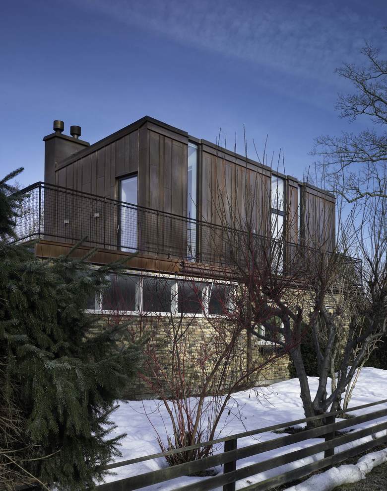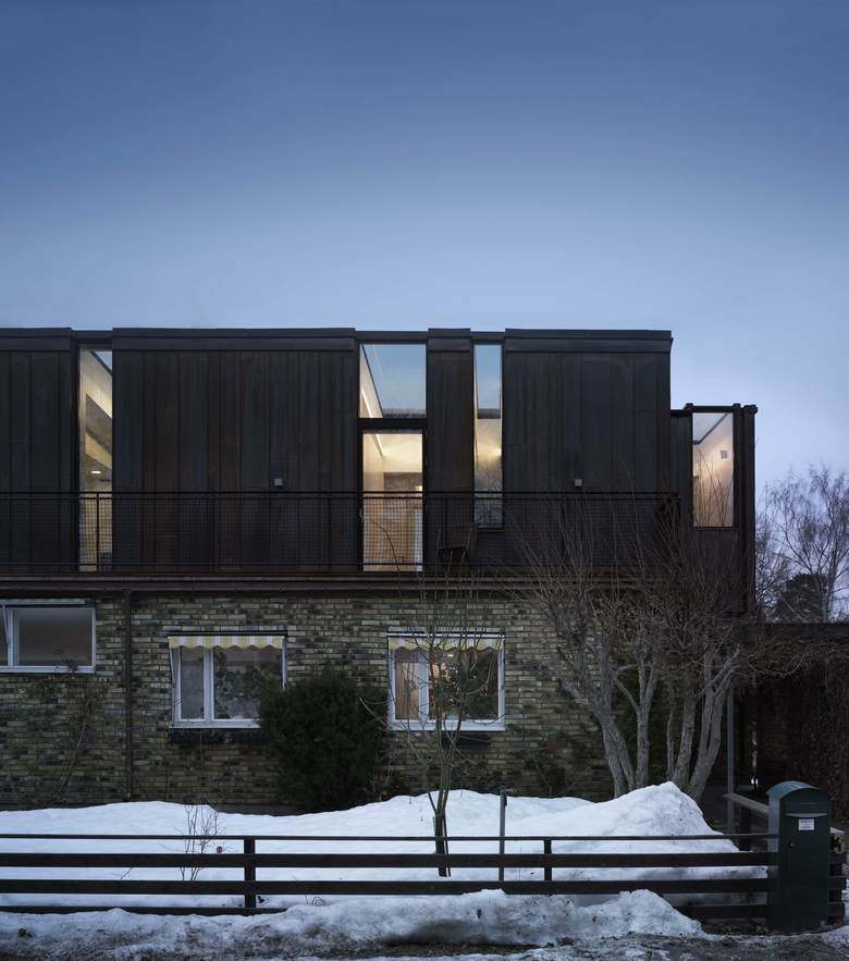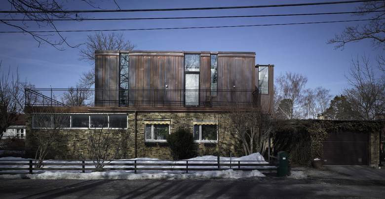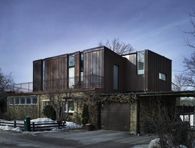 A beautiful architect designed villa from the early 60’s is complemented with two building volumes docked on the roof tops. The new functions include a beautiful parlour with built-in furniture and a view of the inlet. A dressing room and bathroom sit adjacent to the peaceful master bedroom. From the parlour and bedroom roof terraces stretch out in two directions. The sooty yellow brick of the original building is paired with the addition’s copper cladding which will patina beautifully with age. The new facades are composed of vertical window slits connected to elongated sky lights, creating a dynamic day light effect throughout the course of the day.