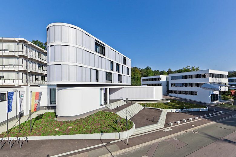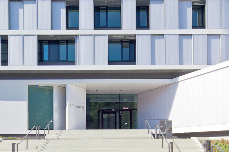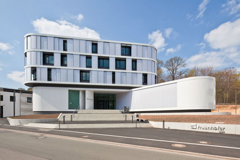 Erweiterungsbau des Instituts für Zerstörungsfreie Prüfverfahren in Saarbrücken um eine große Prüfhalle mit Technikum und Laborflächen, drei Büroetagen und einen großzügigen Eingangsbereich mit Konferenzraum