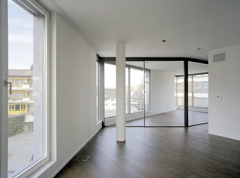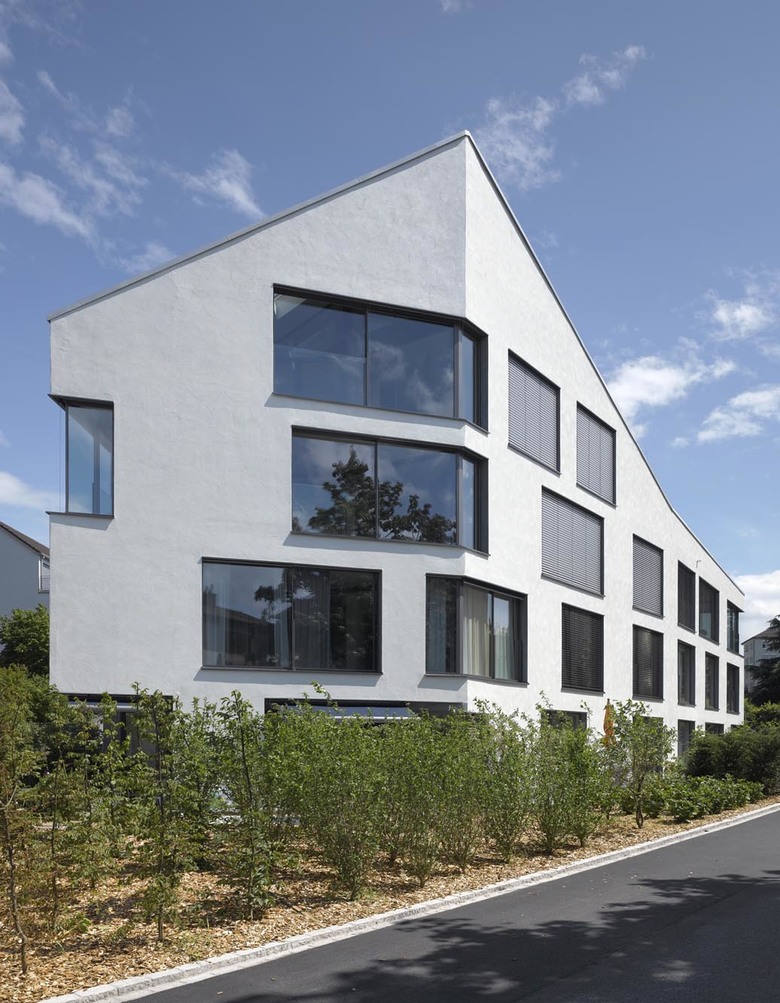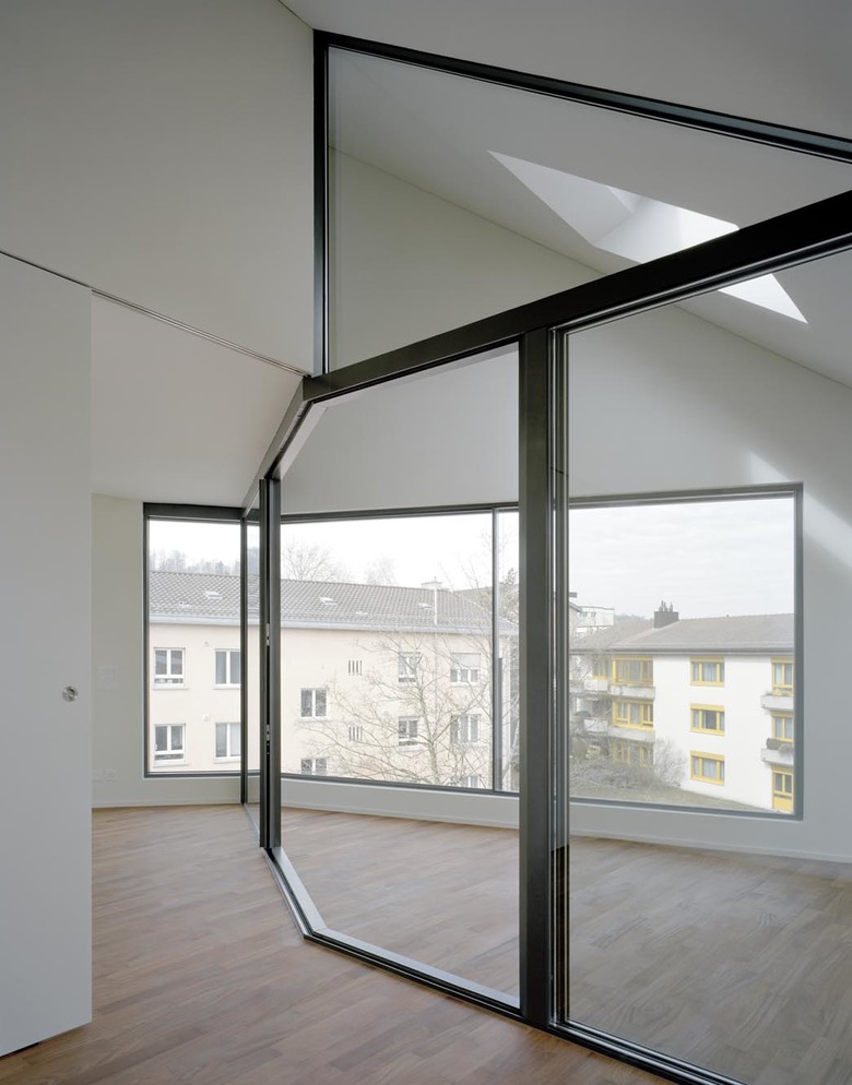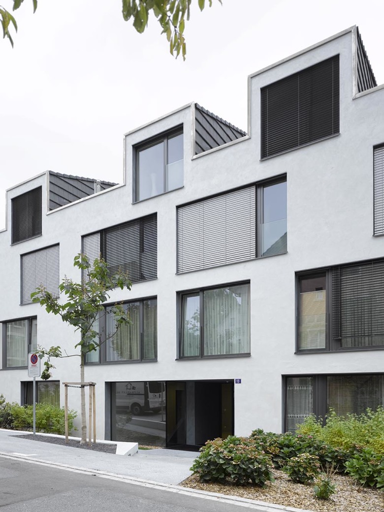 Die grossformatigen Öffnungen verteilen sich lose über die helle, metallisch schimmernde Fassadenhaut, welche das prismatische Volumen fast schon kristallinen erscheinen lassen. Die fein strukturierte Putzstruktur mit einer sanften Lasur aus Metallpigmenten verleihen dem Baukörper Lebendigkeit und lassen auf den leicht abgeknickten Fassadenflächen ein vielfältiges Spiel mit Licht und Sonne aufleben. Die dunkel gestrichenen Leibungen der Öffnungen verbinden sich mit den antrazith-eingefärbten Fensterrahmen und dem tagsüber dunklen Glas und bilden eine abstrakte Einheit in der perlfarben schimmernden Haut. Konstruktiv verbinden sich dabei die Holzmetallfensterkonstruktionen mit den feingliedrigen Aluminiumschiebefenster der Wintergärten, perforieren die Hülle teilweise über Eck und gliedern damit den innenräumliche Wohnungsschnitt.