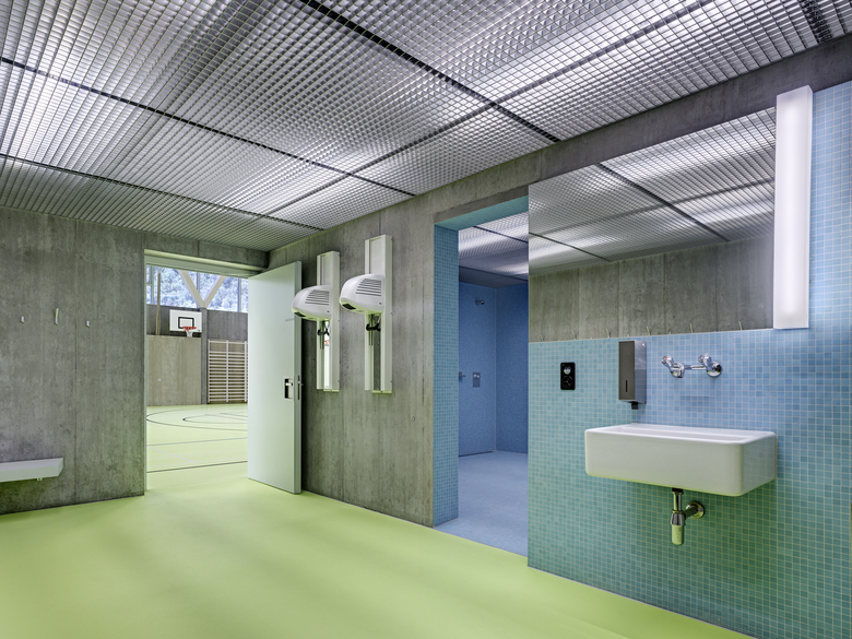 Die neue Turnhalle setzt sich westseitig zu den zwei Schulhäusern und schafft ein neues baukörperliches Gleichgewicht zwischen sich und dem Bestand. Der Pausenbereich wird dreiseitig von Schul- und Sportnutzung gesäumt und erhält mit dem Eingriff eine adäquate zentrale Bedeutung für das Schulgelände. Das leichte Ausdrehen des Hallenneubaus und die volumetrische Ausformulierung des flachgeneigten Daches akzentuieren den Eingang zum Turnen und schaffen gleichzeitig Voraussetzung für die bisher fehlende räumliche Verbindung zum Aussensportbereich der Anlage. Die innere Organisation der Turnhalle profitiert vom natürlichen Geländeverlauf und verbindet im Innern das obere Pausen- und Eingangsniveau über einen tribünenähnlichen Erschliessungsbereich mit Sportplatzniveau und eigentlicher Hallennutzung. Zudem wird sowohl über die innere und äussere Schnittlösung als auch über die angebotenen Zugänglichkeiten die Nutzungsflexibilität erhöht und die zentrale Rolle der Turnhalle im Gebrauch gestärkt. Vergleichbar zur vorliegenden Wettbewerbsaufgabe, kann mit dem Neubau ein neue Identität geschaffen werden und unter Einbezug einer punktuellen Bereinigung der Umgebungsgestaltung wesentlich zur Aufwertung der Gesamtschulanlage beigetragen werden.