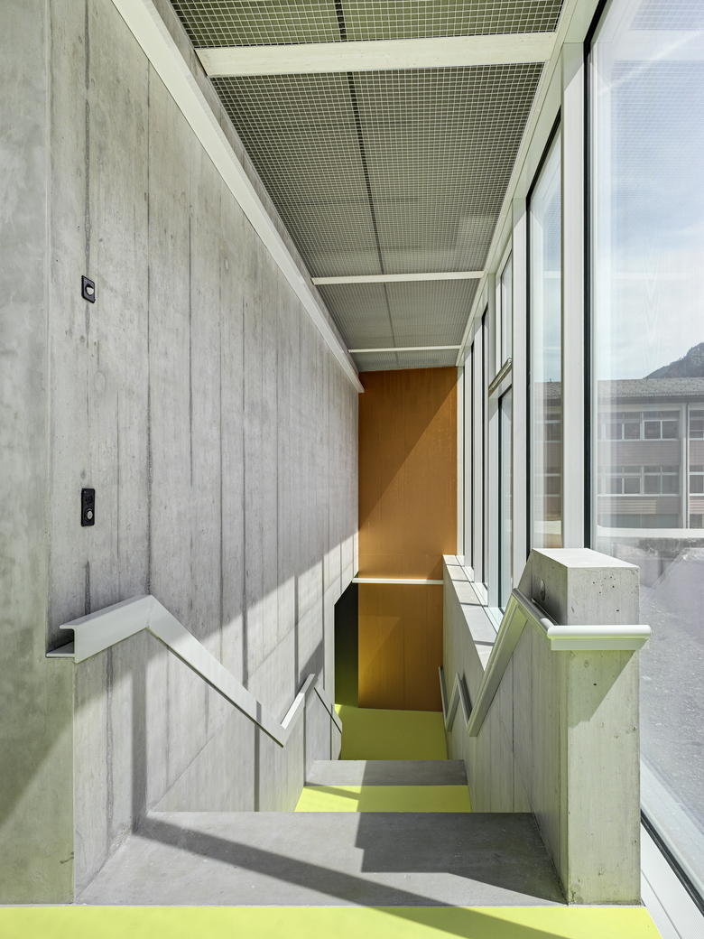 Konstruiert ist die Halle als Holzfachwerksbau mit Trägern und Stützen in vorfabrizierten Kerto-Holzelementen. Eine Statik, welche in der gewählten Form, den Holzbau gestalterisch wirksam macht, verbindend zwischen Dach und Fassade vermittelt und ein optimiertes Gesamttragwerk für das ganze Haus zur Folge hat. Von Aussen wirken der im Terrain verankerte Sockel aus lasierten Beton, zusammen mit dem umlaufenden Verglasungselement als Pfosten-Riegelsystem und der mit Spenglerblech verkleideten Dachkonstruktion als ruhiger Dreiklang der Materialien und lassen das innere hölzerne Gerüst nach aussen wirken. Die Siebbedruckung des Glases sowie deren technische Qualität bieten nebst Aussicht und Ausdruck, optimale Belichtung für den Sportbetrieb ohne Blendeinwirkung.
