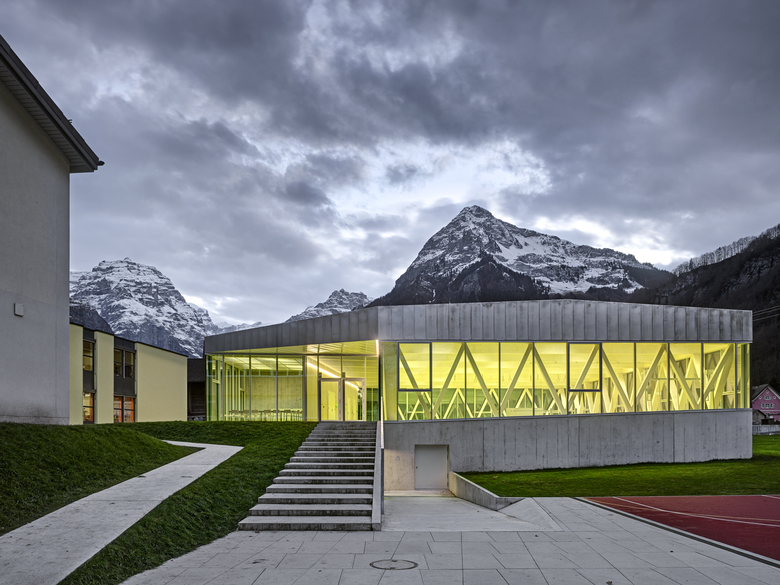 Der konzeptionellen Logik der Baukörperstellung und der inneren Organisation entsprechend, folgt auch die äussere Erscheinung. Das offene, verbindende Eingangsgeschoss wird über die umlaufende Verglasung allseitig thematisiert. Einblicke von aussen direkt in die Halle wie auch Durchblicke auf und durch das Tragwerk inszenieren sich selbst und das umliegende Panorama. Entsprechend ruhiger formuliert sich Dach- und Sockelbereich in Material und Form und bindet über eine feine Diversifizierung der geometrischen Linien und Kanten den Baukörper zu einer gestalterischen Einheit zusammen. Aufgrund der gekappten Ecke des Volumens als Vordach und damit verbunden den ungleich langen Giebelfassaden, verschiebt sich so die Firstrichtung schräg über die Halle. Im Zusammenspiel mit der schräg verlaufenden Sockelkante, welche ihrerseits zur Umgebung vermittelt, wandelt sich die scheinbar einfache geometrische Grundform zur reichhaltigen Erscheinungsform mit entsprechend komplexer Detailanforderung.