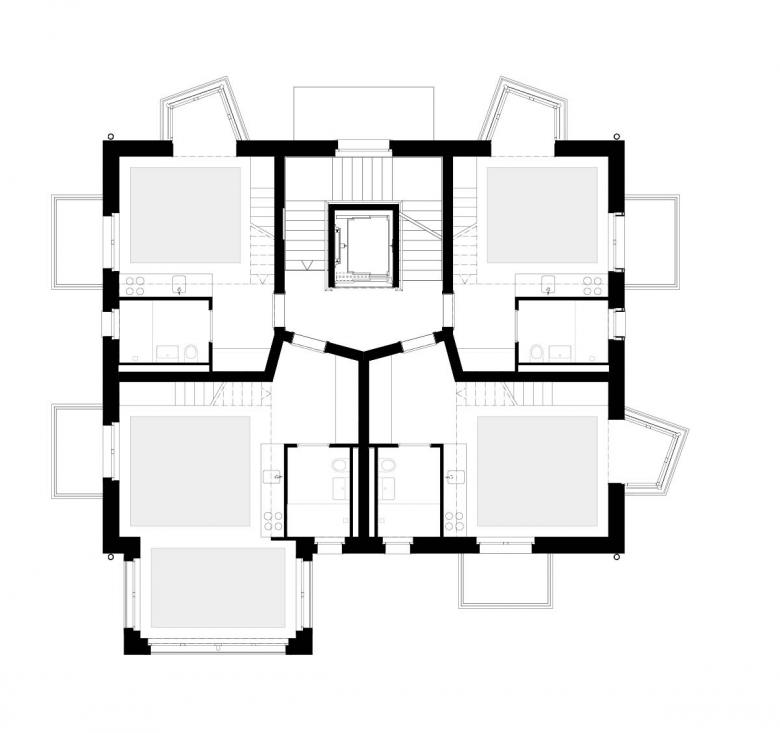 Das vorgegebene Volumen erlaubt aussergewöhnliche Raumhöhen von 3.90m, was wiederum den Einbau von Galerien in den Regelgeschossen ermöglicht. So können an der ausgeprägt städtischen Lage insgesamt 10 Micro-Appartements realisiert und eine hohe Ausnutzung des begrenzten Volumens erreicht werden. Trotz der minimalen Fläche entfalten die Wohnungen so eine räumlich spannungsvolle Wirkung. Sämtliche Wohnungen haben durch einen Balkon oder eine Dachterrasse Aussenraumbezug, die vier Wohnungen im Hochparterre gelangen zudem über den Balkon direkt in den Garten.