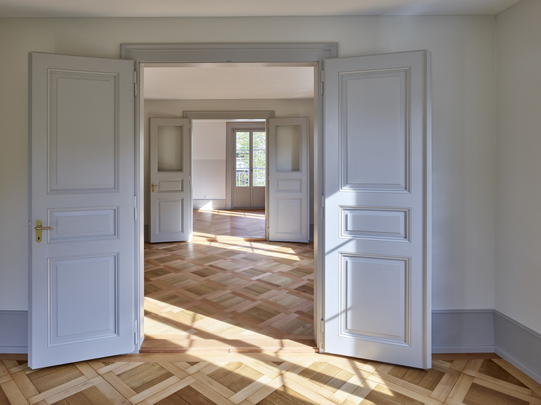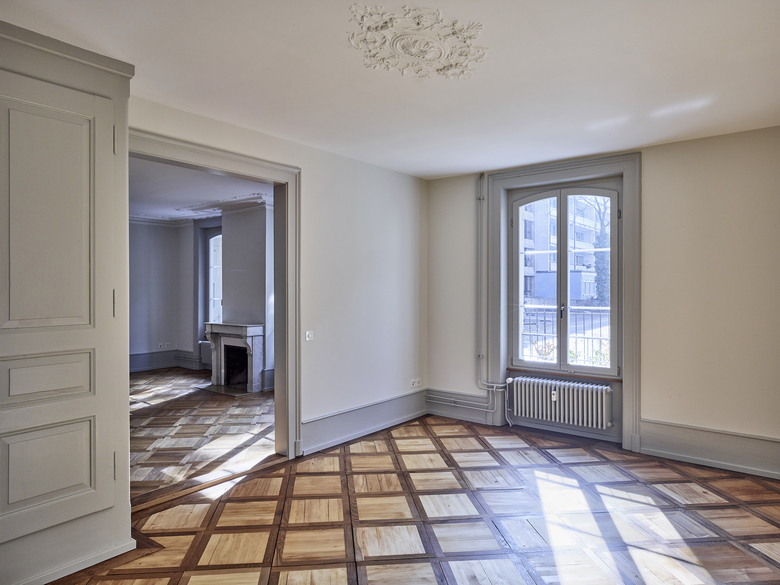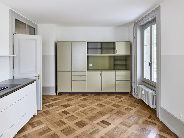 Verschiedene Holz- und Verlegearten von historischen und rekonstruierten Parkettböden und ein durchlaufender Fussladen führen zu einer atmosphärischen Raumstimmung. In Anlehnung an die teilweise vorgefundenen, sechseckigen Zementplatten wurde in den Nassräumen der neue Boden verlegt. Diverse Schichten von Tapeten zeugten wie Jahrringe von mehrfachen Sanierungen und wurden bis auf die Grundstruktur zurückgebaut. Hinter nachträglich eingebauten Schränken fanden wir aufschlussreiche Erkenntnisse zur ursprünglichen Farbigkeit. In Zusammenarbeit mit Denkmalpflege und Restaurator erstellten wir so ein durchgängiges Farbkonzept. Neue Einbauten reihen sich in diese Farbigkeit ein, heben sich aber durch ihre Gestaltung differenziert ab.