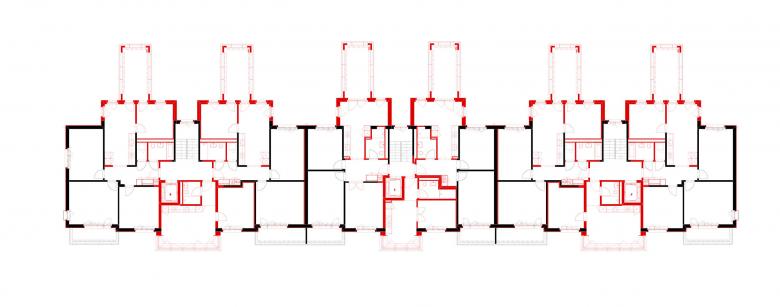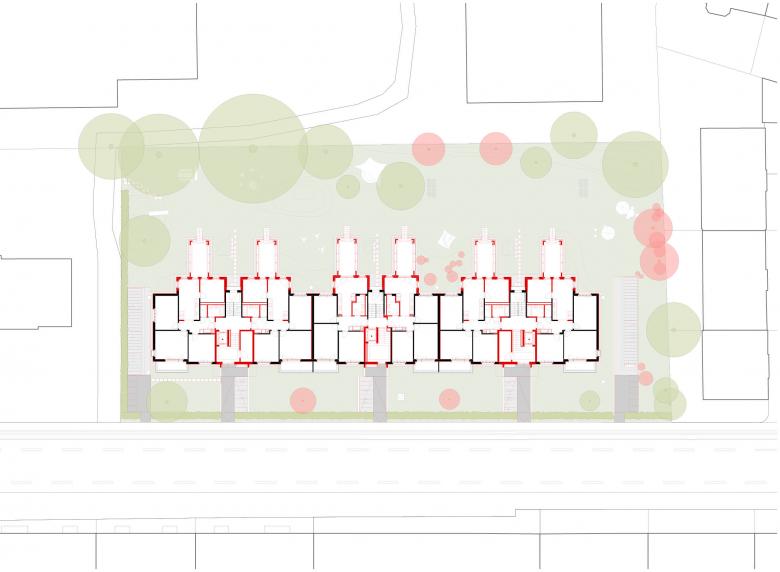 Die Wohnungsanzahl wird von 32 auf 39 erhöht, der Wohnungsmix insbesondere bei Klein- und Familienwohnungen erweitert und die Hauptnutzfläche um beinahe 30% erhöht. Das Dach wird mit PV-Panels gedeckt, ein Dämmputz verbessert die Gebäudehülle energetisch, ohne den Charakter der Zeile zu verändern. Die neuen Elemente wie Erker und Balkone verbinden sich auf selbstverständliche Weise mit dem Bestand.