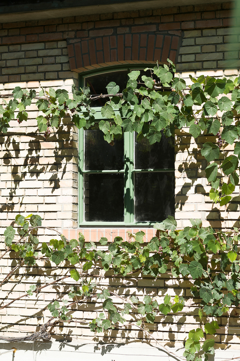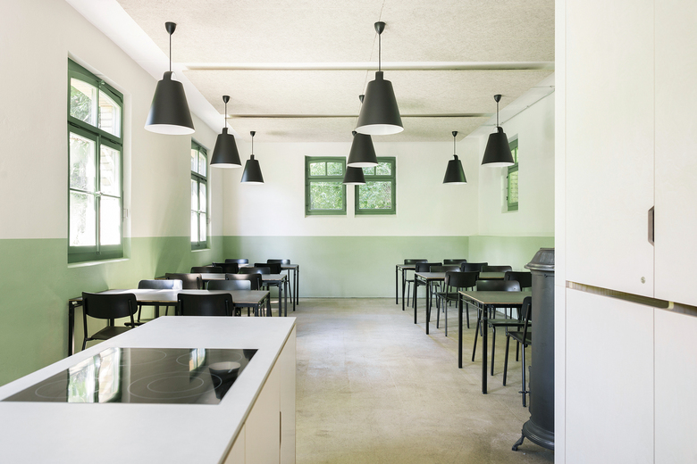 Die Untersuchung der bestehenden Fenster und der Eingangstüre brachte einen kräftigen Grünton als ursprüngliche Farbe ans Licht. Dieser Farbton prägt zusammen mit dem farblich angepassten Sockel im Innern das neue Raumgefühl. Bewusst verzichten wir auf schulungsraumtypische Elemente im Ausbau. Sowohl die eigenständige, dimmbare Beleuchtung als auch die Möblierung assoziiert man eher mit Bildern eines Ateliers oder einer Werkstatt. Für die Kinder soll der Besuch des Angebots der Gartenpädagogik zu einem speziellen Erlebnis werden.