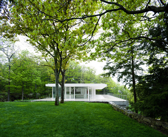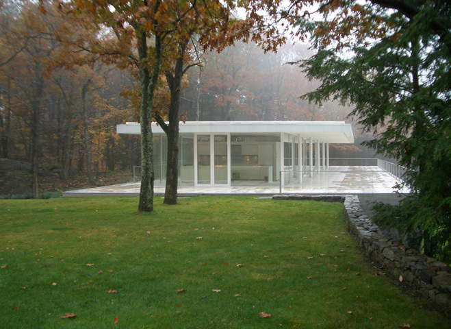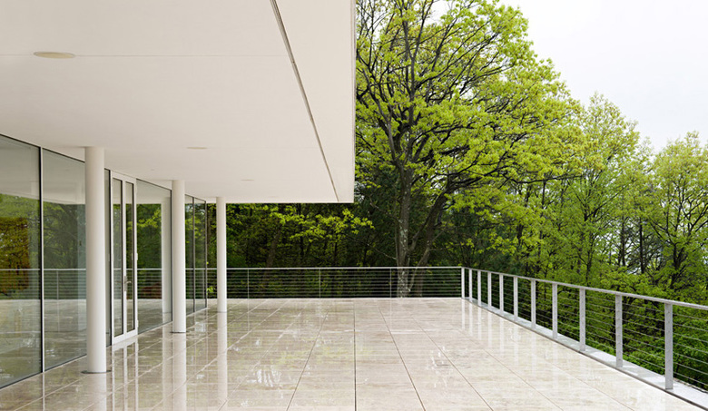 And to protect ourselves from the sun and rain, over the stone plane we raise a light roof 100 feet long by 40 feet wide by 9 feet tall, held by 10 cylindrical steel pillars that are arranged according to a 20 x 20 foot grid. This roof cantilevers 10 feet along all of its sides. And to make this space habitable, we put a glass box under the roof, an enclosure measuring 94 feet long by 25 feet wide. This glass box contains the back row of columns within it and leaves the front columns outside, in order to further accentuate its transparency.