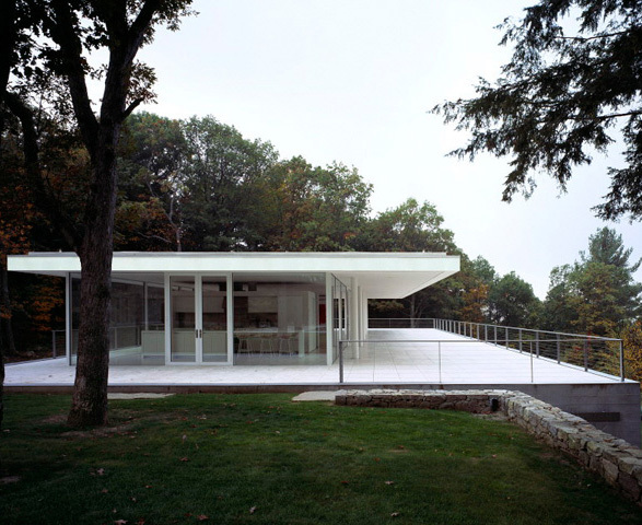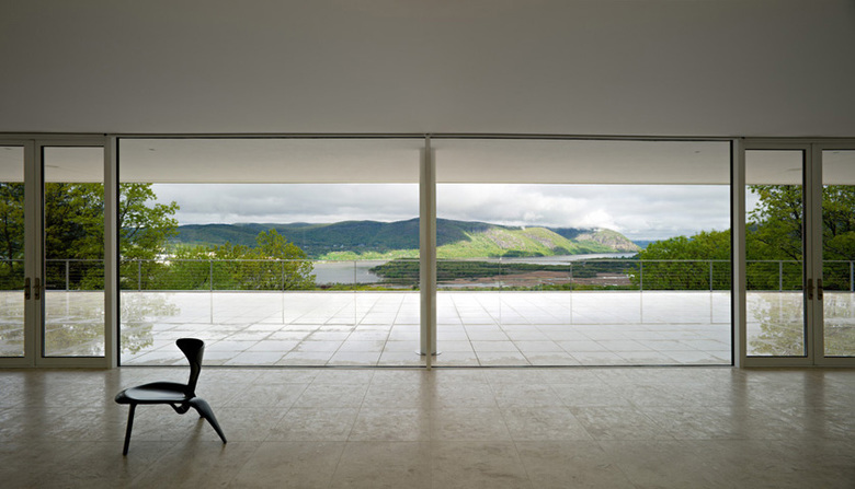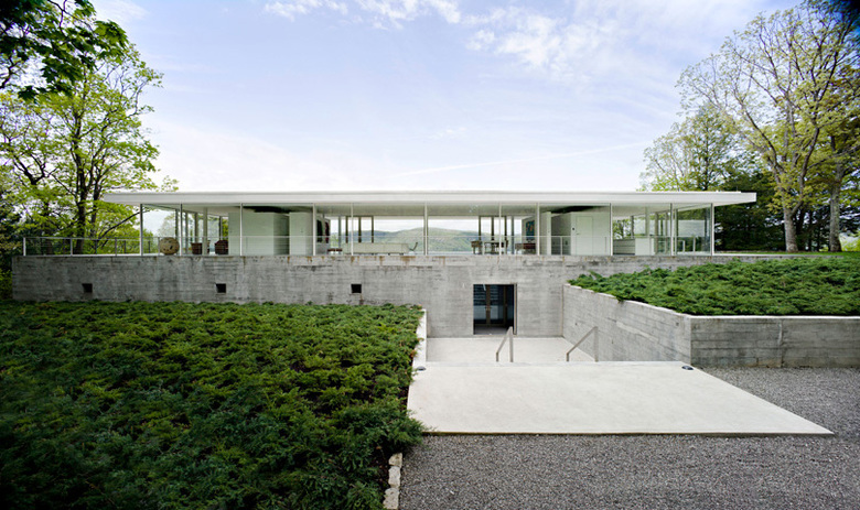 In this impressive place, we establish a plane, a platform that underlines the landscape before us, seeking to enhance it. A large long box is thus built, 122 feet long by 54 feet wide by 12 feet high, with sturdy concrete walls that accentuate its relationship to the land. The roof of this box is flat, paved in stone, travertine, so that we may use it.