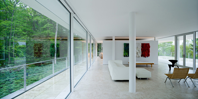This construction on the platform resembles a large table with ten legs. Three areas are created within it, divided by two white boxes that do not reach the ceiling, containing the stairs and service spaces. The central space is the living area, and the dining room has a large white table. On one side, closer to the swimming pool, is the kitchen, and on the other side, in the manner of a pensatorio, the area around the hearth. And below, inside the cement box, the bedrooms and baths are housed. In its central vestibule, connecting the main entrance and the access to the garden, a gallery has been created where pieces of Arte Povera and other pieces of contemporary Italian art are displayed, in addition to other areas around the house.