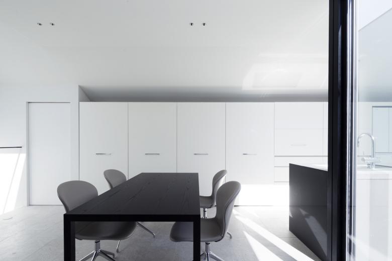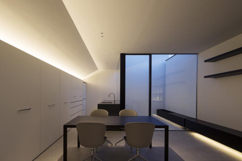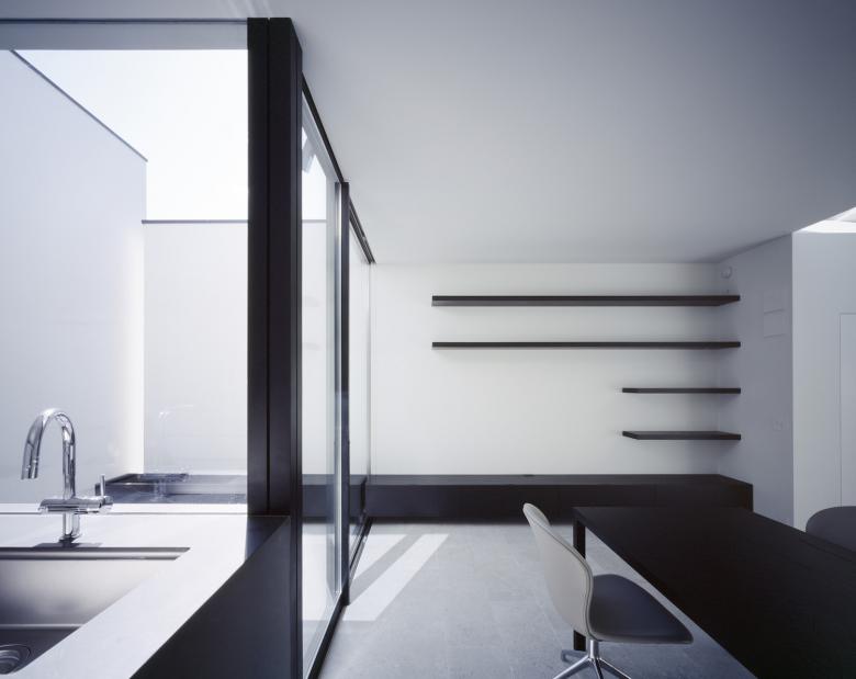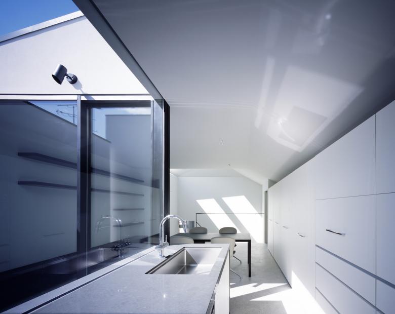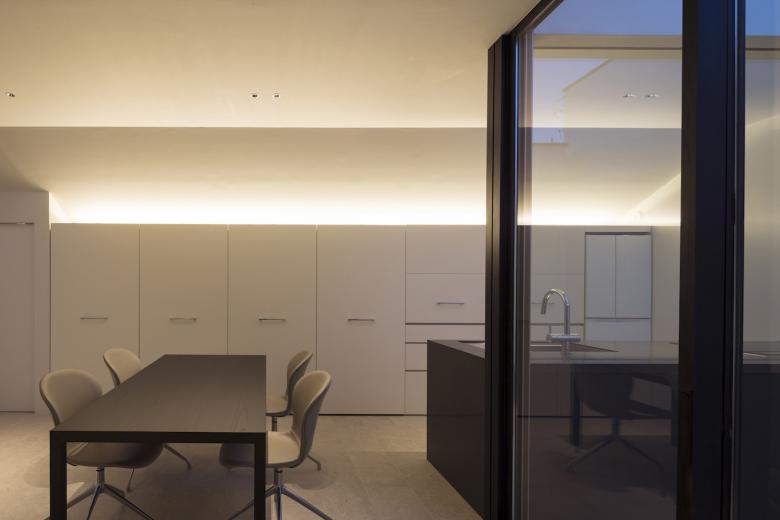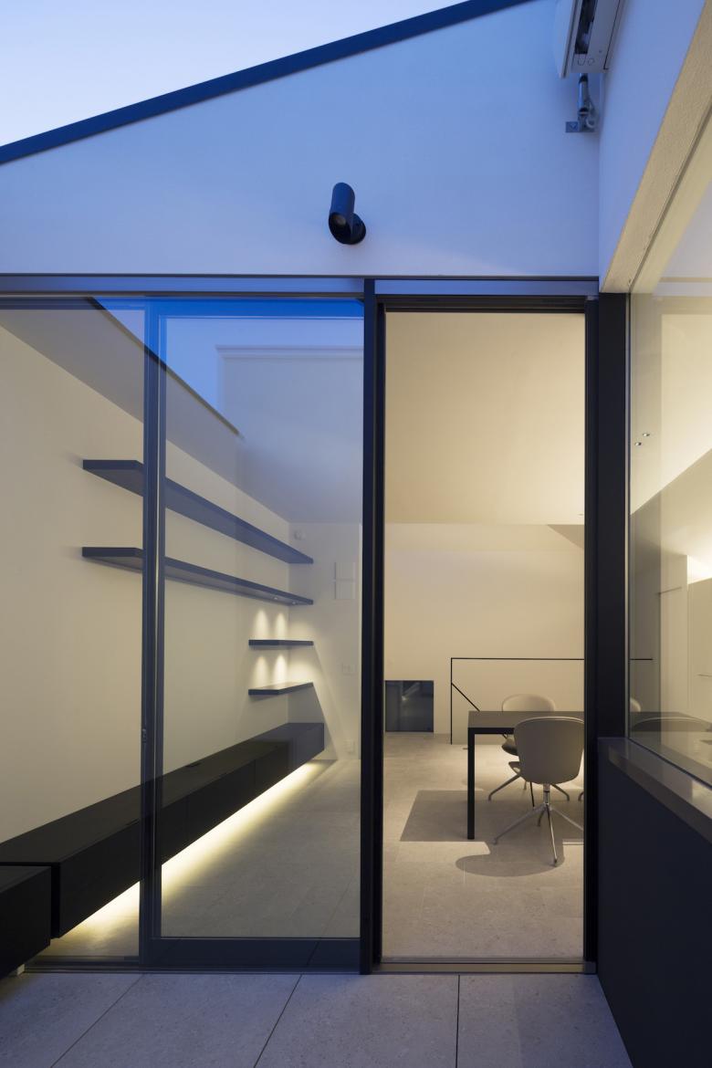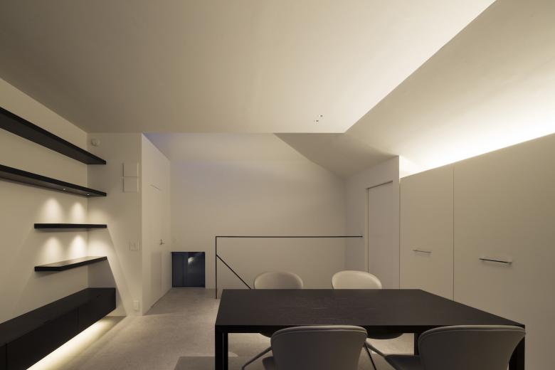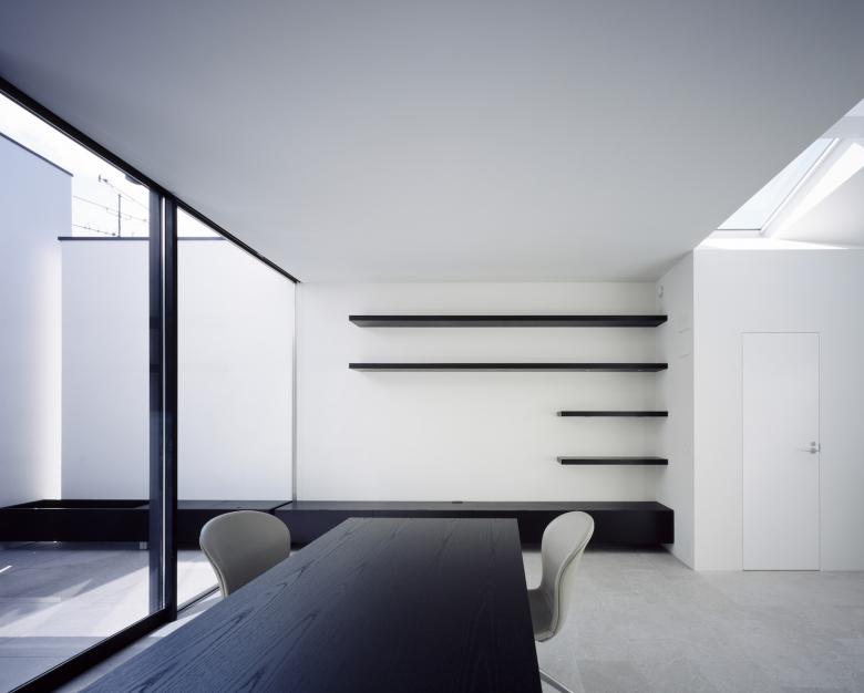 内外で使用しているセラミックタイルの床材や壁材を連続させたり、スチールサッシのフレームを隠すことなどの工夫の集積が、モノトーンかつミニマムな空間をつくりあげている。天井には極力照明器具を設けず、間接照明を基本としたミニマムなライティングデザインを施すことで、空間はまさに宝石のような輝きを帯びている。小さな空間だからこそ密度の高さが生まれることを実証した住宅である。