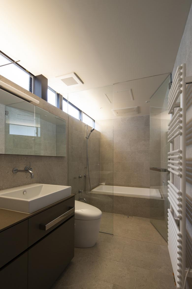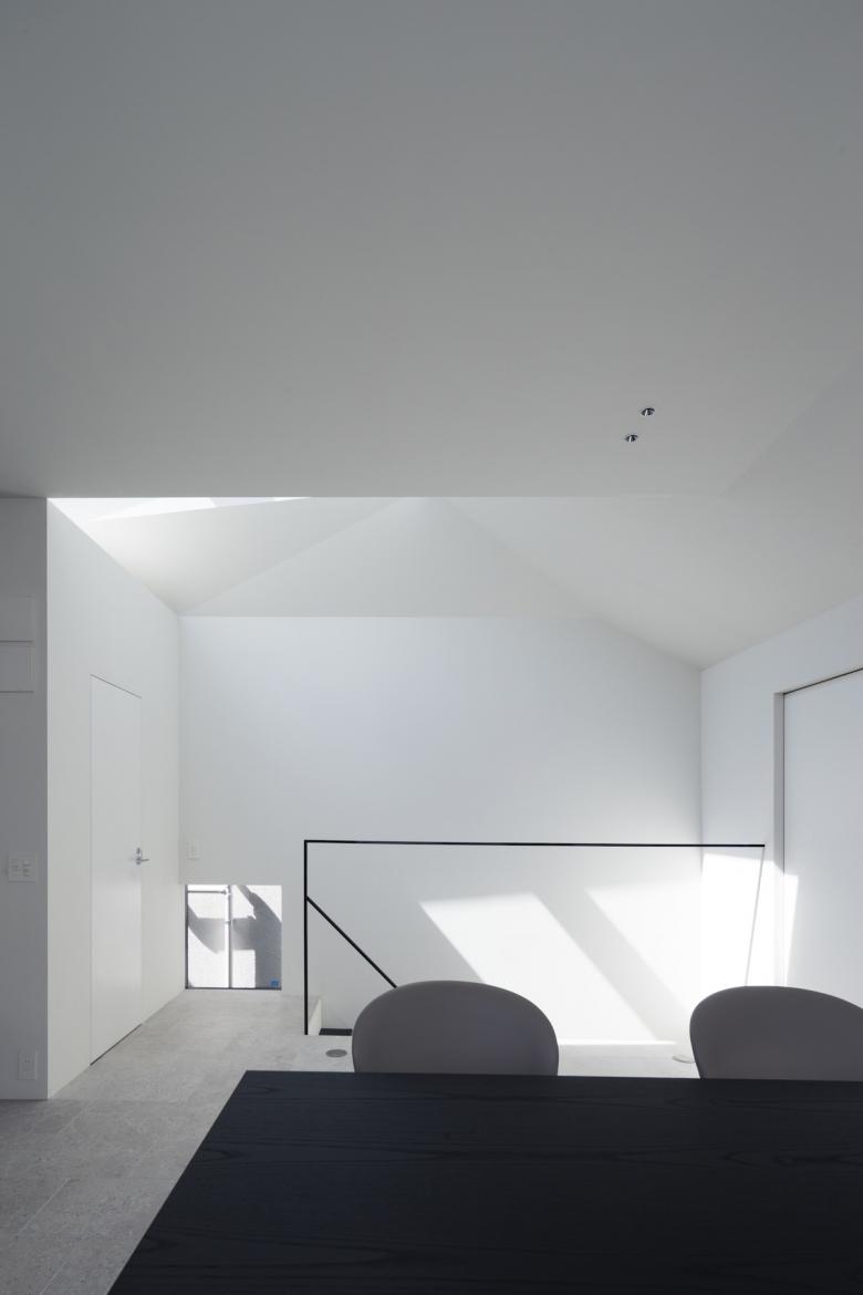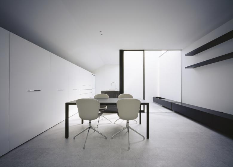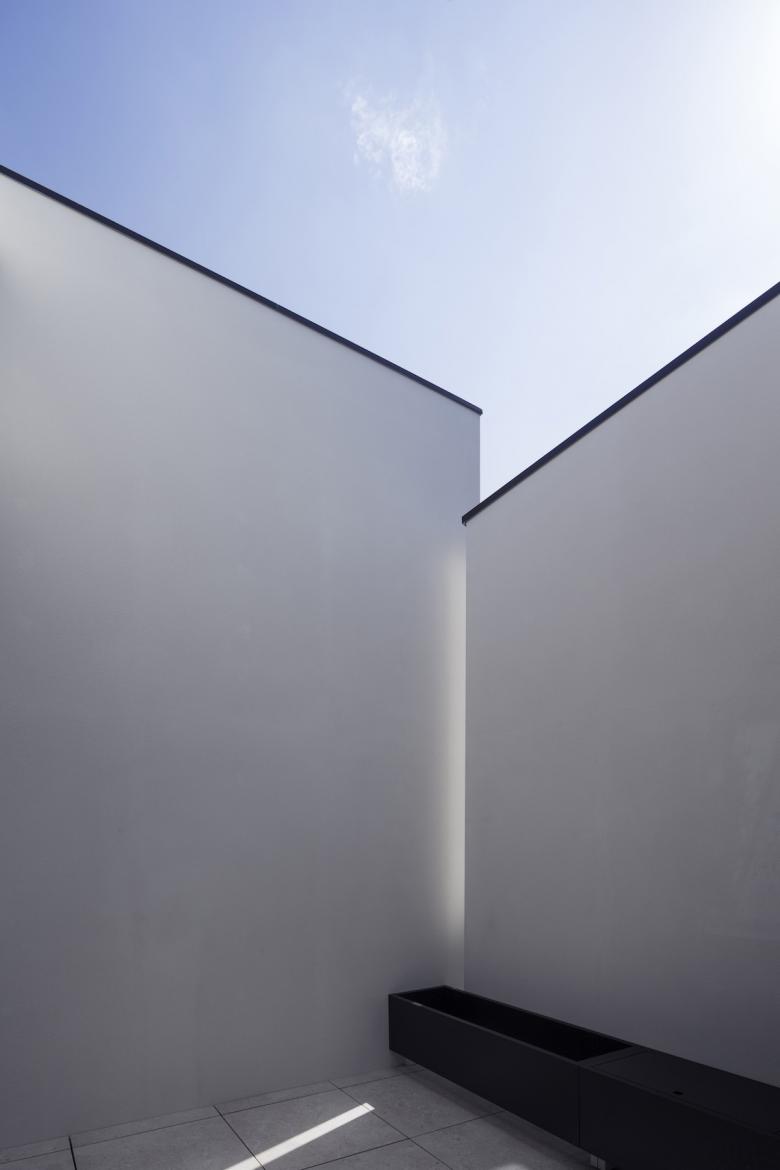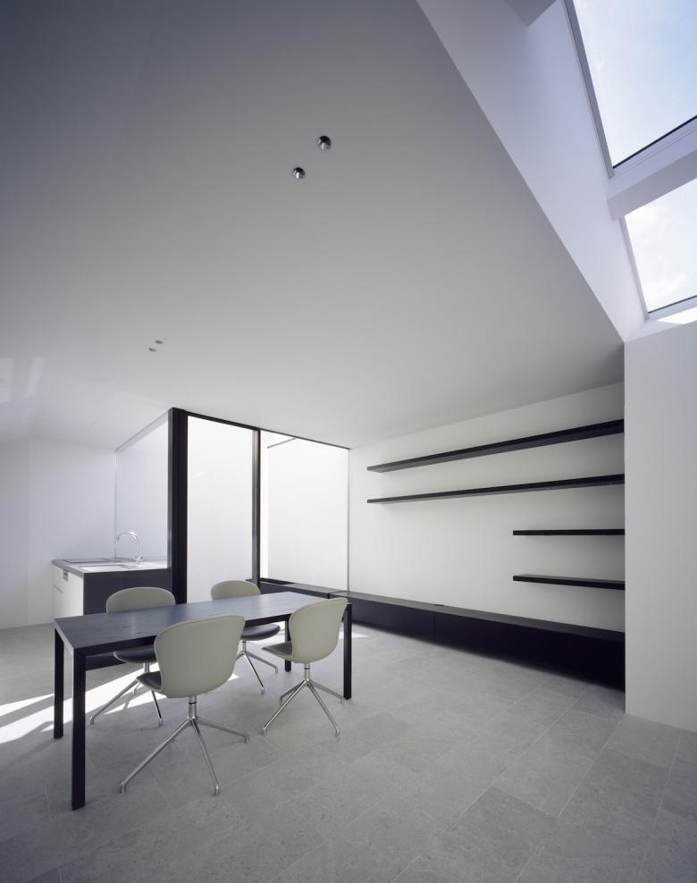 内外で使用しているセラミックタイルの床材や壁材を連続させたり、スチールサッシのフレームを隠すことなどの工夫の集積が、モノトーンかつミニマムな空間をつくりあげている。天井には極力照明器具を設けず、間接照明を基本としたミニマムなライティングデザインを施すことで、空間はまさに宝石のような輝きを帯びている。小さな空間だからこそ密度の高さが生まれることを実証した住宅である。