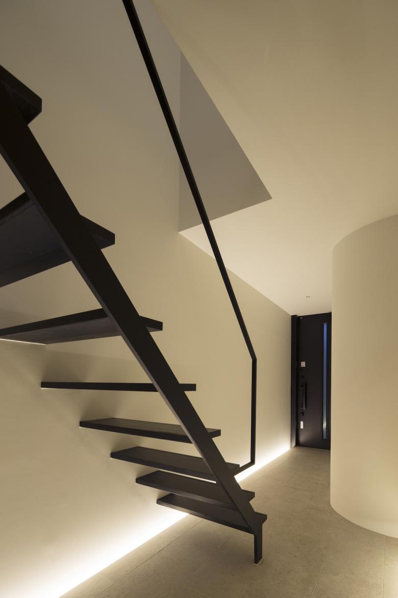 アプローチ階段の先にある建物のファサードは細長い路地の印象をシンプルにデザインし、外装には黒いガルバリウム鋼鈑を使用している。ひとたび内部に入ると外部とは反転した白一色の空間が広がり、シンボリックなスチール階段が上階へ誘う装置として機能している。階段上部にはトップライトを配置し、1階に柔らかい自然光が降り注いでいるのが特徴だ。