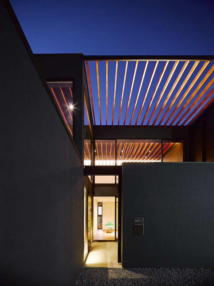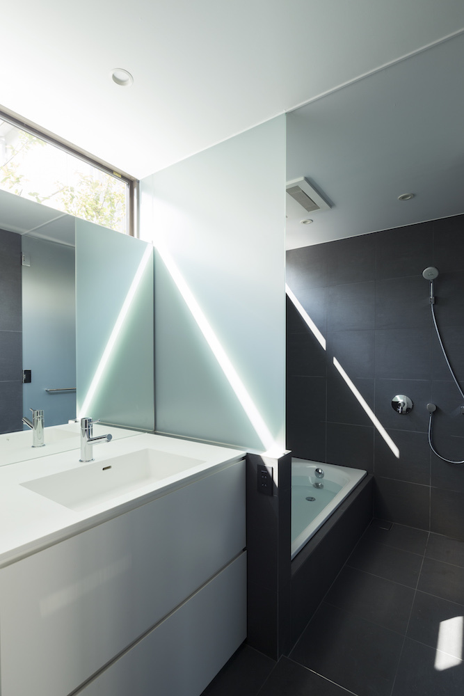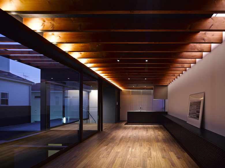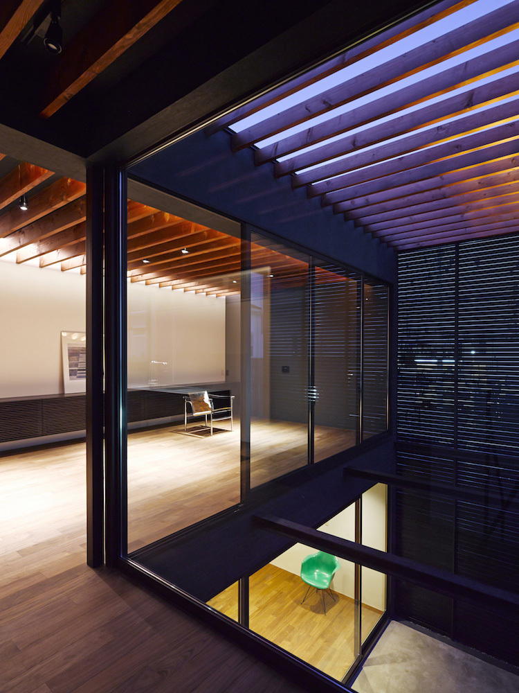 2階天井の一部にスリット状のスカイライトを設け、降り注ぐ自然光のシャワーが壁面に陰影を刻むシーンも演出。また、垂木の間に設けたLEDランプによる建築化照明が主体構造であるSPF材や野地板を美しく照らし、ドラマチックな光のグラデーションが生みだされている。中庭上部のパーゴラの下面に柔らかいアッパーライトを照射することで浮遊感が溢れる夜のシーンをつくりあげている。