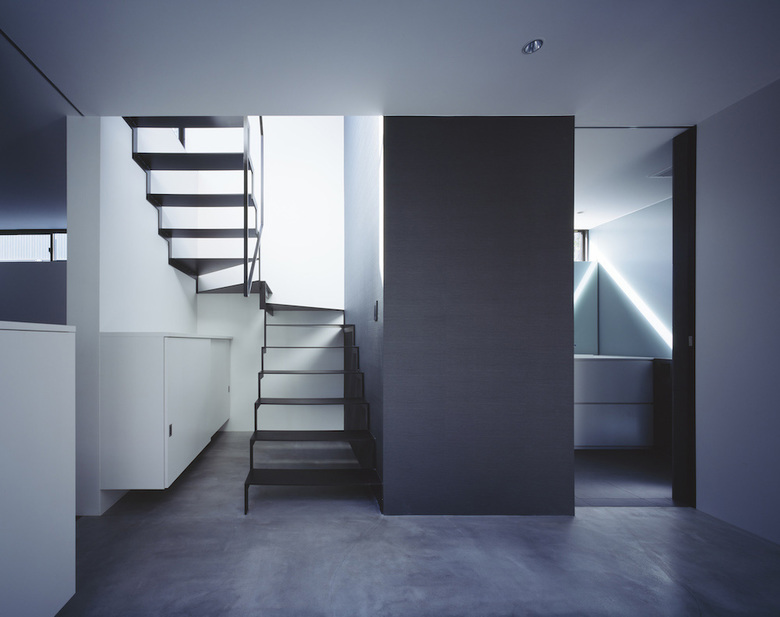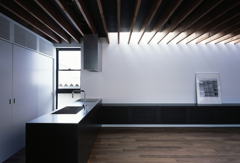 玄関正面にはエントランスオブジェにもなるストリップ階段を配置。それを上ると間仕切りがないワンルームの2階が現われる。フラット天井を構成する美しい現しの垂木によって空間全体が連続して覆われ、エントランスコート上部にもパーゴラを連続させることで、内外の空間に一体感を持たせている。