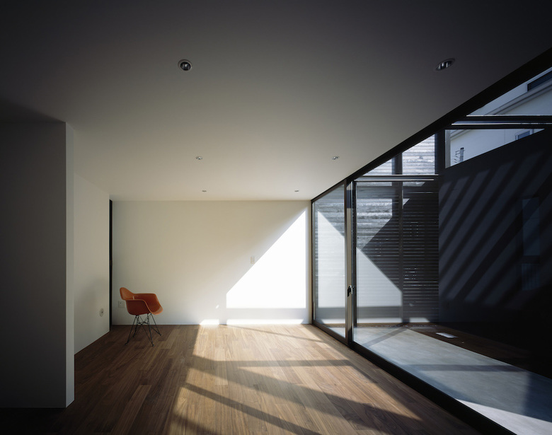 サーフィンが趣味のご主人は、両親が所有する土地の一角に西海岸のケーススタディハウスのような解放感溢れる住宅を求めて計画がスタート。月極駐車場の奥に位置する住宅であることから、視線の問題を考慮し、外壁面にはあえて開口部を設けないファサードとした。中庭を取り囲むシンプルなL型平面とすることで工事コストを抑え、中庭とエントランスアプローチを兼用することで生まれた程良い中間領域が、内外のスイッチとして機能している。