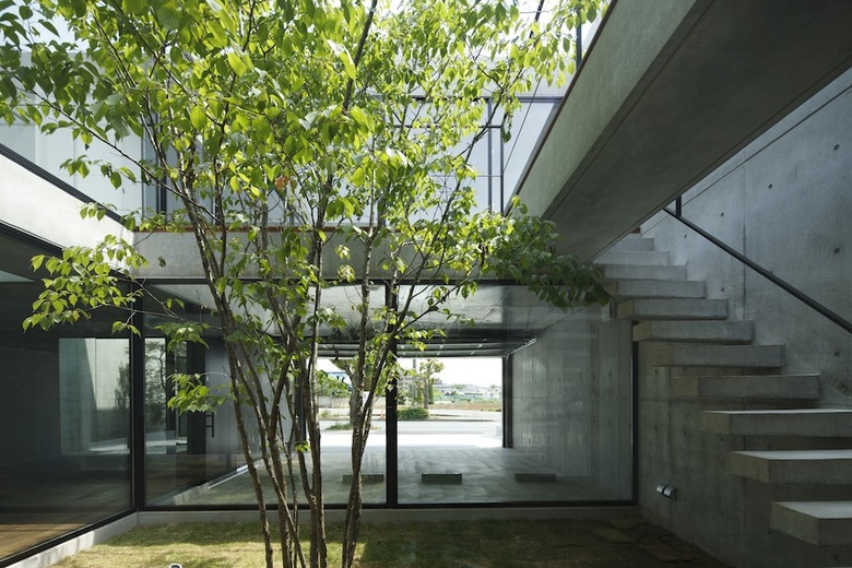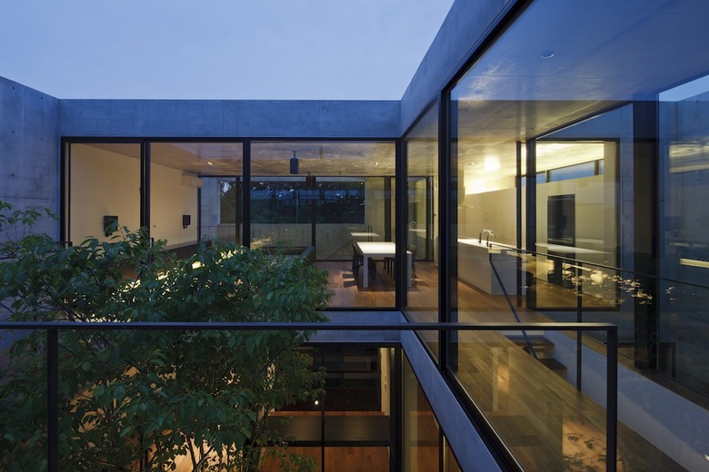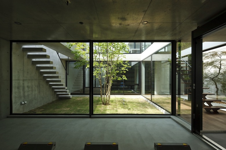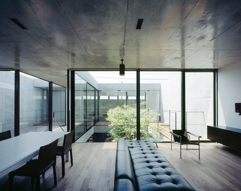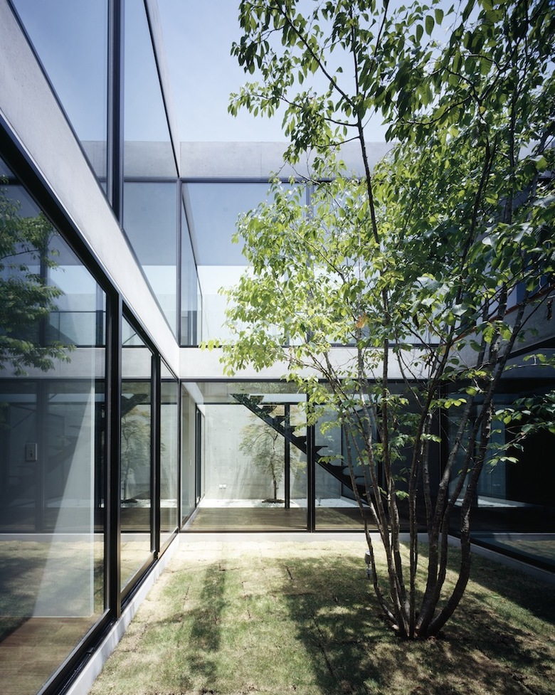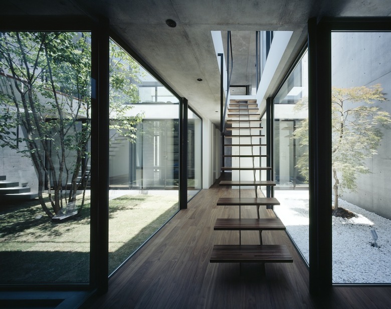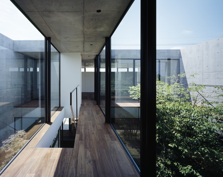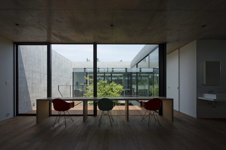 クライアントが100坪の敷地にこだわったのは家の中心に大きなシンボルツリーのある中庭を望んでいたため。そこで、玄関ドアの正面に紅葉を眺めるエントランスコート、中廊下を挟んだ反対側にはメインコートを、そして敷地奥にもバスコートを設けることで様々な庭の表情を楽しむことができる。道路面から最も離れた1階奥には寝室と水廻りを設け、シンボルツリーを眺めながらと1日の疲れを癒すことができるようにした。寝室横には家でも仕事ができるよう本格的な書斎を設け、エントランスコートに面して設えた和室では床座を楽しみながらリラックスができるようメリハリを考慮した。