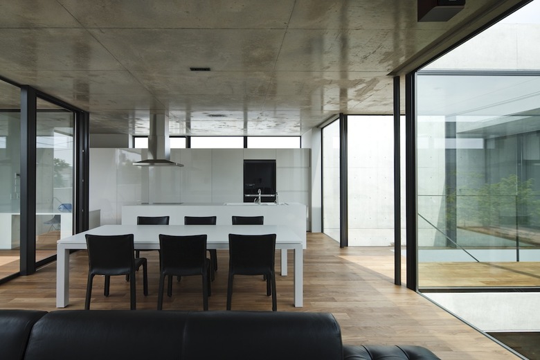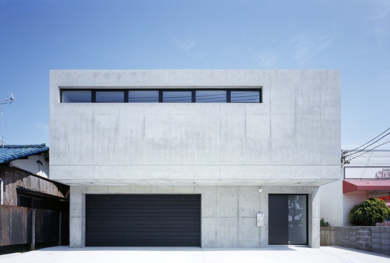外科医のご主人と奥様が日常のハードワークで疲れた体を癒す空間を求めて購入した土地は街道沿いに面した100坪ほどの整形地。求められたのは3人のお子さん達と共に生活する大らかな空間だ。大型車が行き交うため安全を考慮し、前面道路から建物はセットバックされ、3台分の駐車場として活用している。また遮音性能の高いRC造とし、開口部は最小限に抑えることで騒音問題も十分にクリアすることができた。