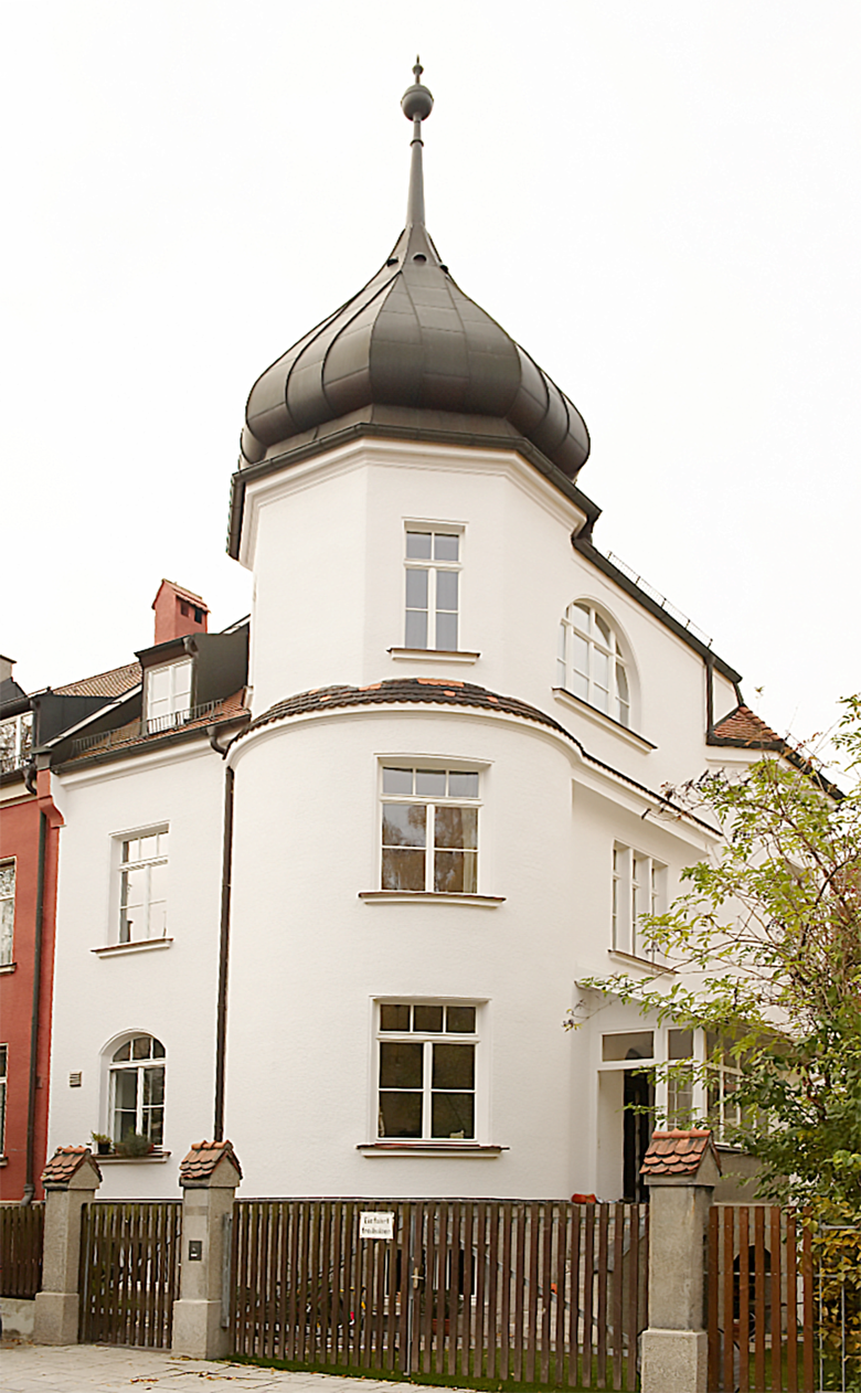 “Die Fassade des historisierenden Eckhauses einer denkmalgeschützten Reihenhausgruppe des Architekten Rudolf Hofmann von 1902 wurde im Rahmen einer Gesamtsanierung ebenfalls instandgesetzt. Besondere Erwähnung verdient hierbei die Erneuerung der unpassenden Fenster durch gut profilierte Holzisolierglasfenster, deren Teilung durch historische Fotografien belegt ist. Der Windfang wurde grundlegend über- arbeitet und die Putzflächen ausgebessert. Ein gebrochen weißer Fassadenanstrich ersetzt nun den ockerfarbenen Vorzustand und kann als stilgerechte Interpretation gesehen wer- den. Insgesamt eine solide Instandsetzungsmaßnahme mit verbesserter Fassadenwirkung, die das Anwesen in der Villenkolonie Gern wieder gut zur Geltung bringt und als Vorbild für die Fassadengestaltung der teilweise zu kräftig kolorierten Häuser in der Nachbarschaft dienen kann.”