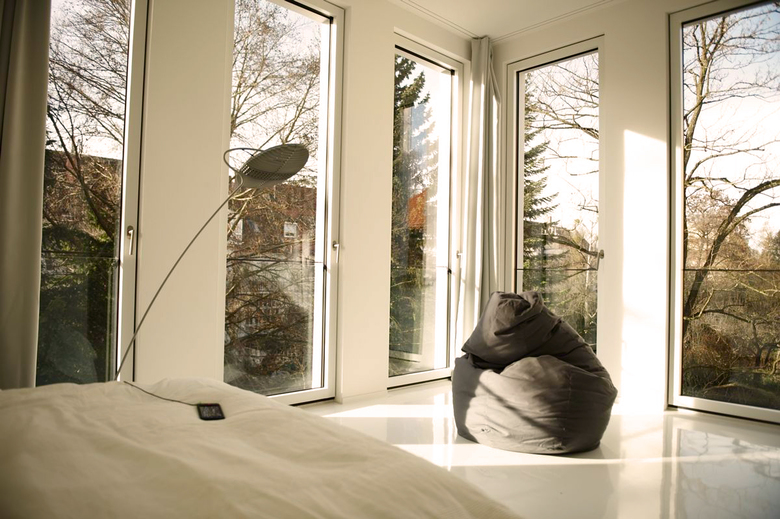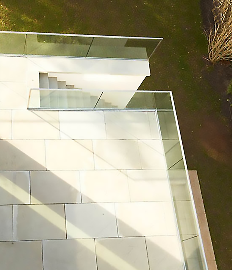 Nach Ertüchtigung der Holzbalkendecke wurde eine Fußbodenheizung installiert, Terrazzo und Epoxydharz wurden als Belag für die Räume verwendet. Die 2,70 m hohen Innentüren wurden mit eigens entwickelten Blockzargen und verdeckten Bändern eingebaut. Zeitgemäße Bänder und eine energieeffiziente Haustechnik mit Bauteilaktivierung wur- den installiert. Um den Raumbedarf zu erfüllen wurde der Bestand im Westen durch einen Anbau erweitert.