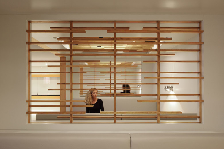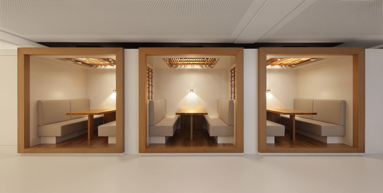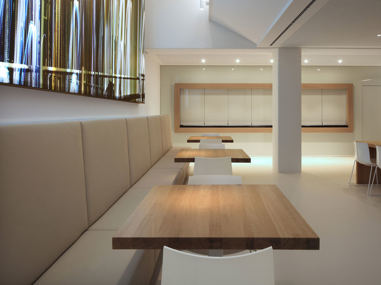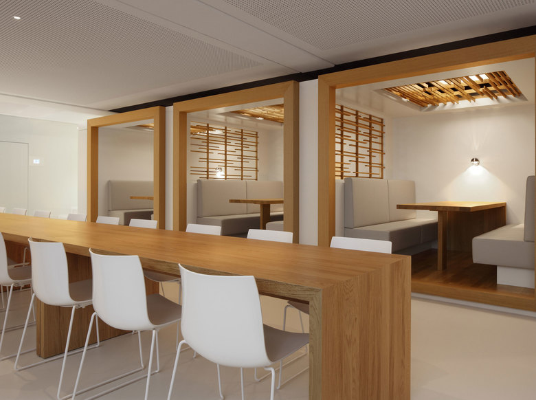 Innenraum – Der Grundriss ist räumlich klar in drei Bereiche gegliedert. Der größere Bereich das Casino - Séparée, Tafel, lange Bank sind für den Mittagstisch konzipiert. Die drei Séparées bieten den Mitarbeitern anschließend Rückzugsmöglichkeiten um Besprechungen abzuhalten. Der rückwärtige Lounge-Bereich wird den gesamten Tag als Cafeteria genutzt. Das neue Erscheinungsbild des Casinos I Lounge ist modern und in hochwertigen Materialien ausgeführt.