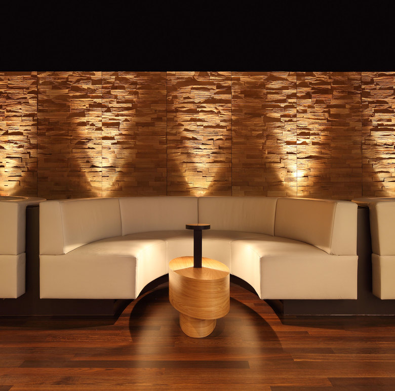 Lounge – Der Lounge-Bereich steht im Kontrast zum Casino und ist in gedeckten Farbnuancen gehalten, lediglich das helle Leder welches auch im Casino verwendet wurde wiederholt sich hier. Die beleuchtete Spaltholzwand erzeugt ein angenehmes und behagliches Licht. Der Bodenbelag aus geräucherter Eiche fügt sich hervorragend in das vorhandene Farbkonzept ein und bildet somit einen räumlich hochwertigen Gesamteindruck.