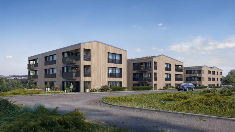 Material – Die Häuser werden aus Kalksandstein errichtet und mit einer Holzfassade verkleidet. Um den natürlichen Charakter des Gebiets der Talaue weitergehend zu unter- streichen, wird das Satteldach mit einer Dachbegrünung ausgestattet.