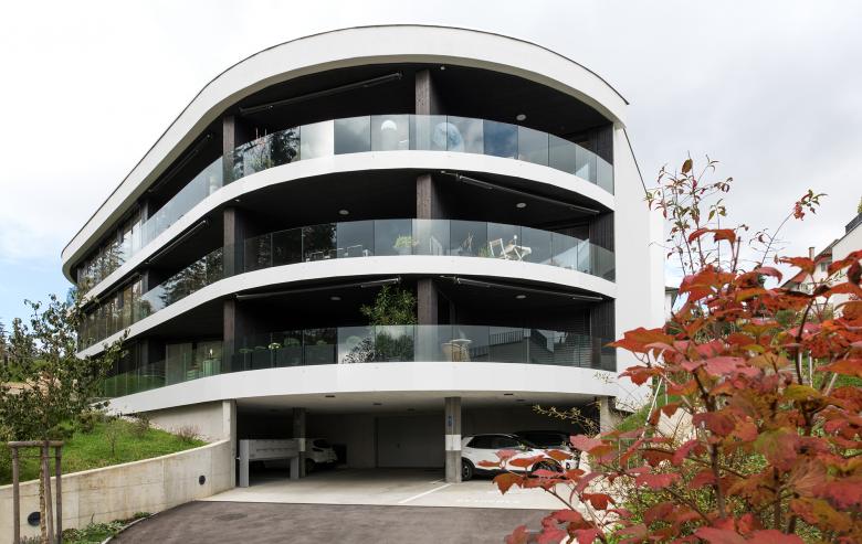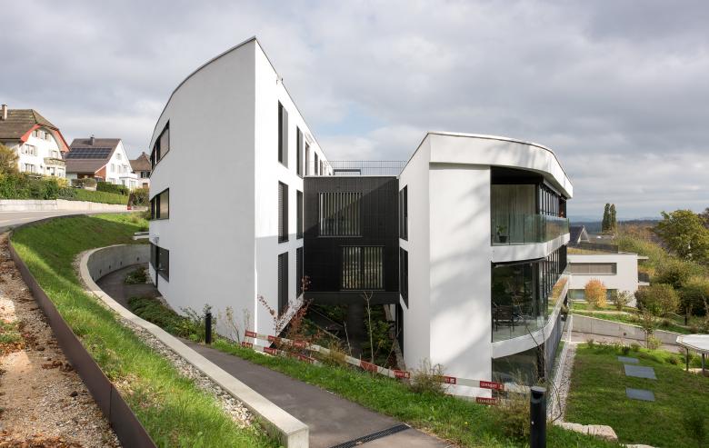 Die Aargauer Gemeinde Küttigen zählt zu den attraktivsten Wohnlagen des Aargaus und wächst stetig. An einem Südhang im Ortsteil Rombach hat die JKB Immobilien AG das Projekt «AAAtrium» lanciert. Die dreieckige Parzellenform liegt eingebettet zwischen Strasse, Wald und Bach in einem steil abfallenden Gelände. Auf die topografischen Gegebenheiten reagiert der Neubau geschickt, in dem er sich in der Höhe staffelt, dem natürlichen Gelände folgt und so den Grundstückscharakter zu wahren vermag.