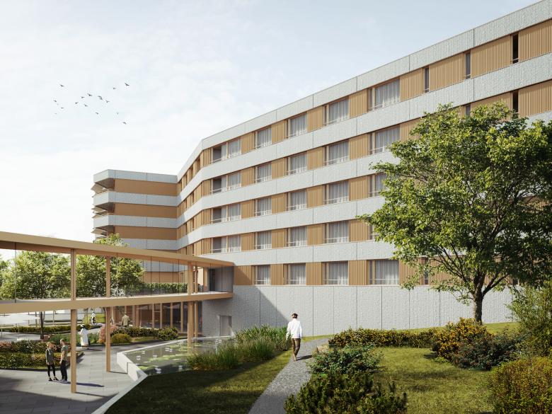 Der bestehende Altbau und der Neubau werden über eine filigrane Fussgängerpaserelle verbunden. Um geringste Aufbauhöhen zu erreichen ist die Passerelle als Stahlbau ausgeführt.
