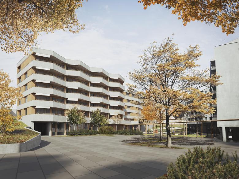 Der Neubau bestehend aus zweigeschossiger Einstellhalle und einem langgezogenen fünfgeschossigen Wohngebäude ist in den steilen Hang eingebettet. Das Gebäude ist mit Ortbeton Flachdecken ausgeführt. Die sehr weit auskragenden Balkone ergeben komfortablem Aussenraum für die Wohnungen und prägen die Fassade.