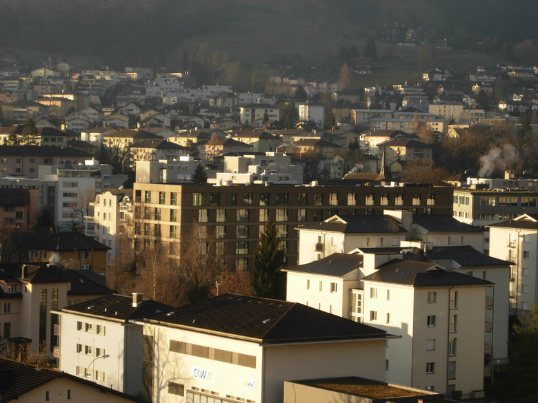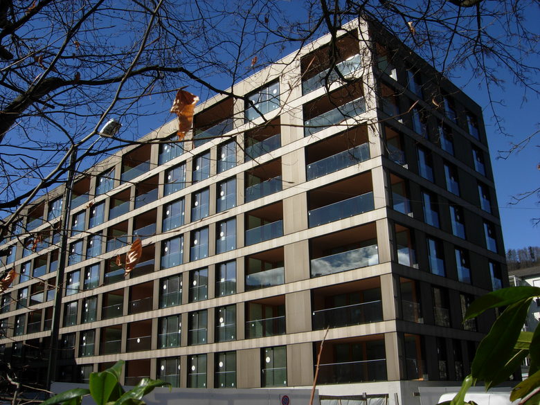 Die Wohnüberbauung besteht aus einem Lang- und einem Punkthaus die über eine gemeinsame Einstellhalle miteinander verbunden sind.