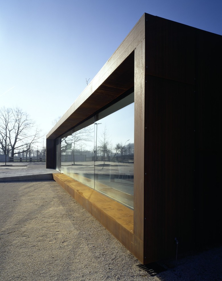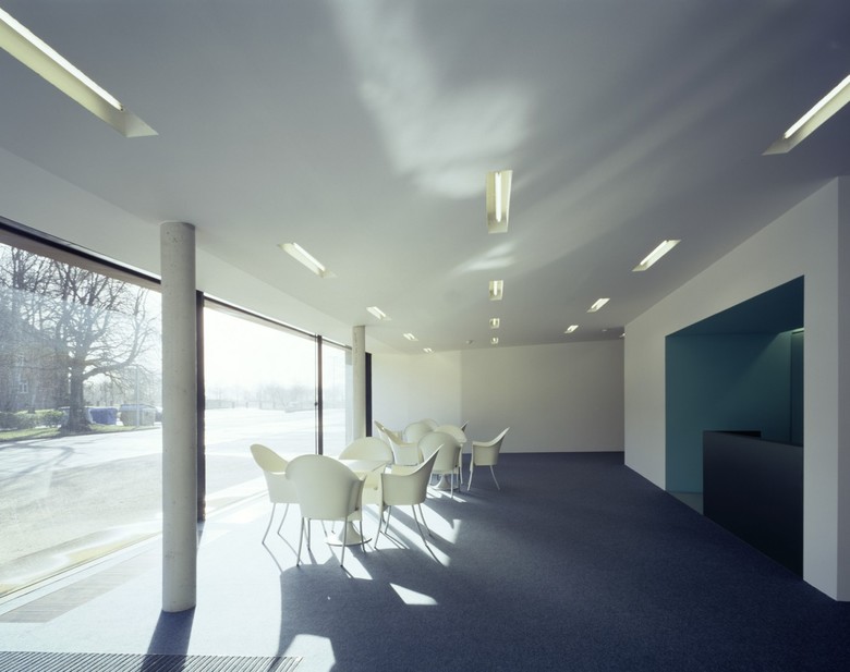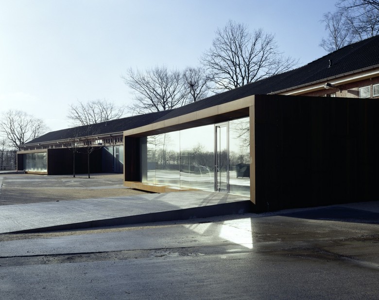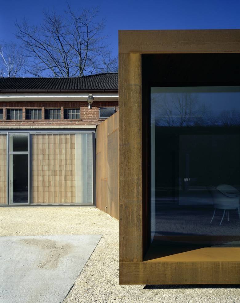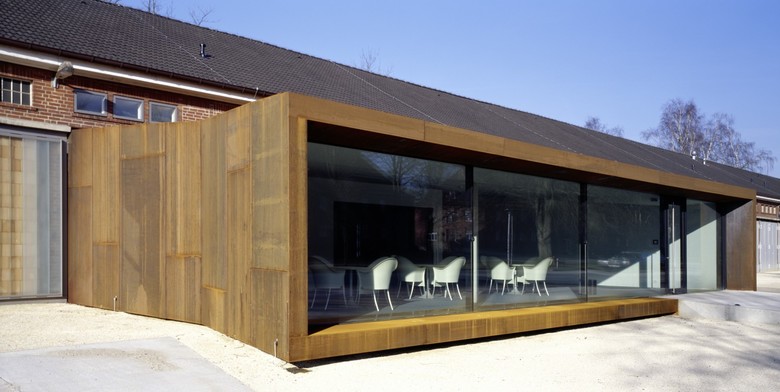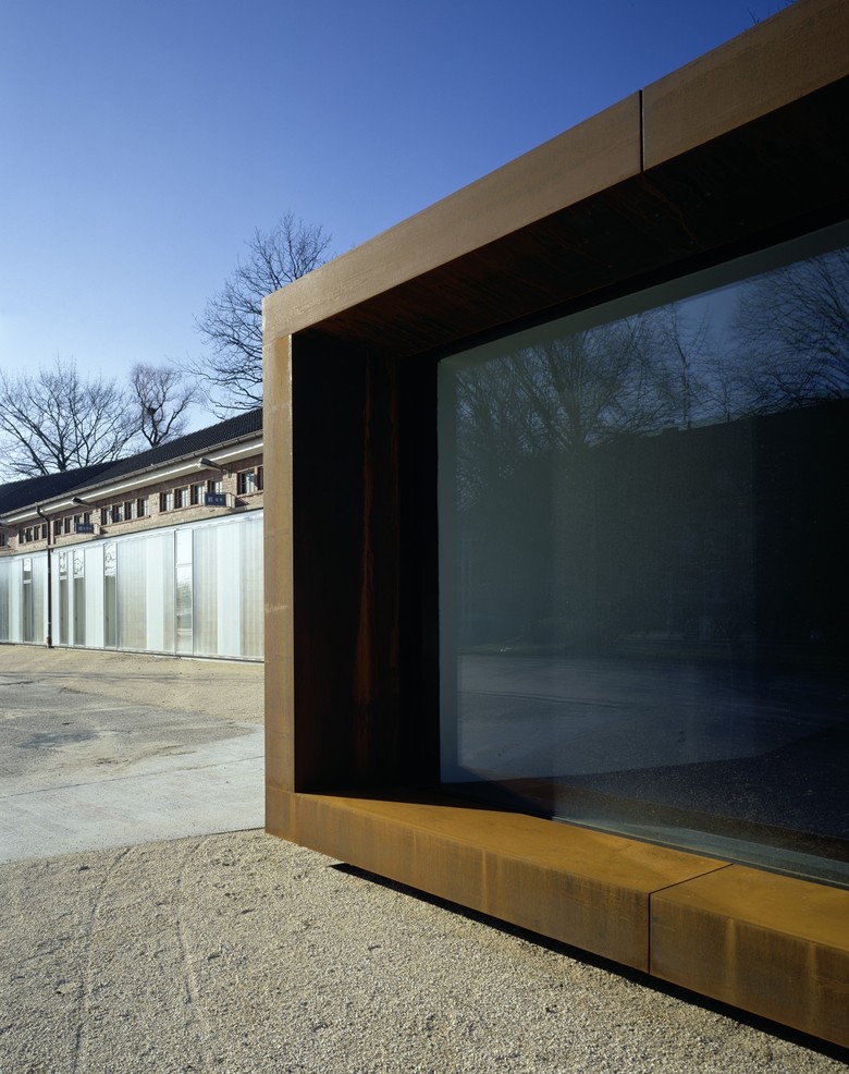 Die alten Fahrzeughallen der Kaserne erschienen aufgrund der Konstruktion und Gebäudehöhe nicht als geeignet für den Bau von Labors und Büros für geisteswissenschaftliche Forschung. Aus Gründen der kurzfristigen Verfügbarkeit und wegen der positiven architektonischen und finanziellen Erfahrungen aus den anderen Altbauten wurde jedoch auch hier ein Umbau für ein zeitlich begrenztes „Provisorium“ mit zwei ergänzenden Eingangsbereichen für die beiden Nutzungsbereiche erstellt. Die Eingangsbereiche wurden als eingeschossige, aus dem alten Baukörper herauswachsende Öffnungen mit einer geschosshohen, rahmenlosen Verglasung ausgebildet, die von einer Corten-Stahlhaut umschlossen sind. Durch diese ruppige Materialität respektiert der Anbau die bestehende Halle und verbindet sich mit ihr.
