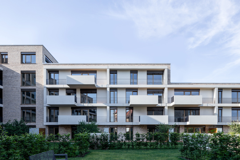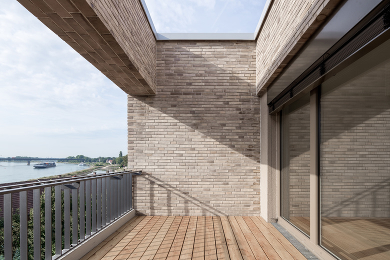 Die Architektur des Quartiers wird geprägt durch winkelförmige, terrassierte Baukörper, die sich zum Rhein öffnen und jeweils einen begrünten Wohnhof mit einer Stadtvilla umschließen.