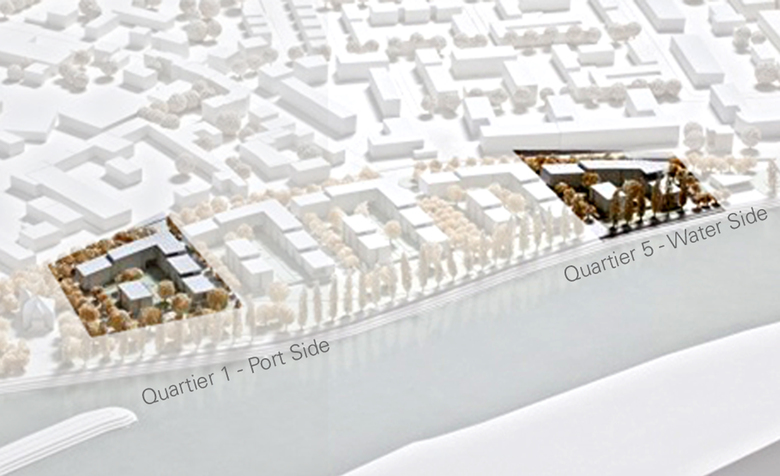 Die von Böge Lindner K2 Architekten entwickelten zwei Baufelder Quartier 1 - PORT-SIDE und Quartier 5 - WATER-SIDE bilden den der Stadt zugewandten südlichen und den nördlichen Abschluss des Quartiers.