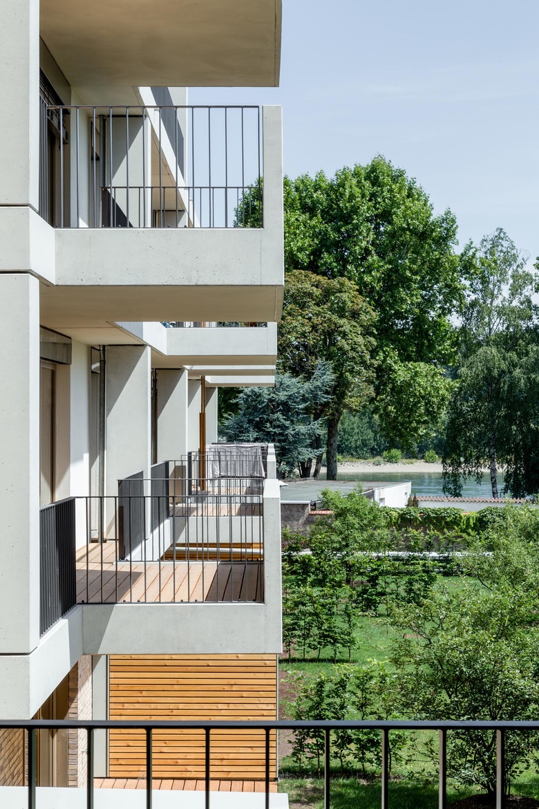 Das städtebauliche Konzept des Büros Kränzle Fischer Wasels gliedert das Grundstück in fünf Baufelder, deren Zwischenräume als begrünte Durchgänge fußläufige Verbindungen von der Straße zum Rhein bilden. Durch den Niveauunterschied zwischen Bebauung und Promenade wird auch die Privatsphäre des Wohnens geschützt.