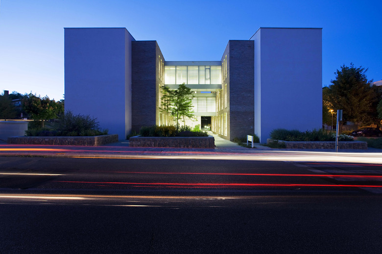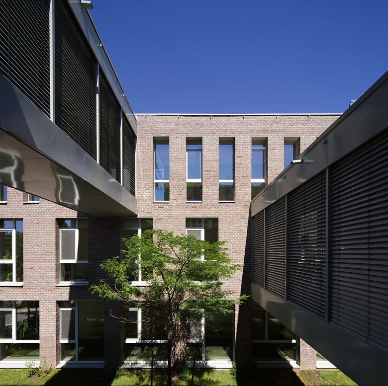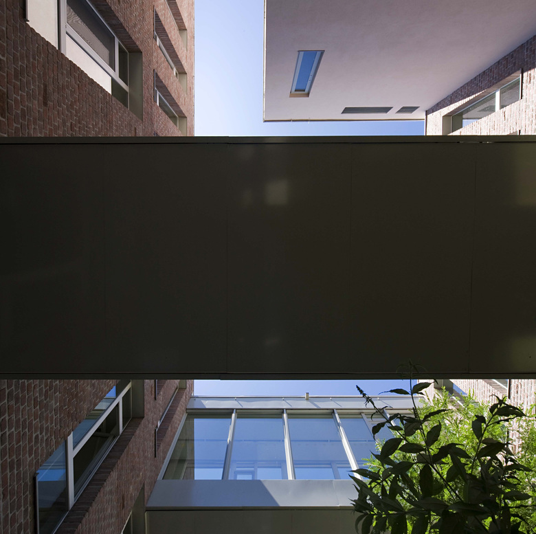 The high-tech glass bridges connecting the blocks and the facades from the inner court padded with a mixture of local red stone and brick coating, of the same color, give the building a public character. 2 out of the three slipped blocks is shown fully from the street side following the rhythm and set-up of the apartment houses. This is enhanced by the large openings of the inner corridors facing the court that creates a direct contact between the interior spaces - the yard and the street. Unlike the straight edged sealing’s of the surrounding apartment buildings the moving of the main volume's roof resulted in a more human-friendly design while it does not disturb the unity of the street. The building compounds the present pure geometrical forms of the street and the traditional architectural characteristics.