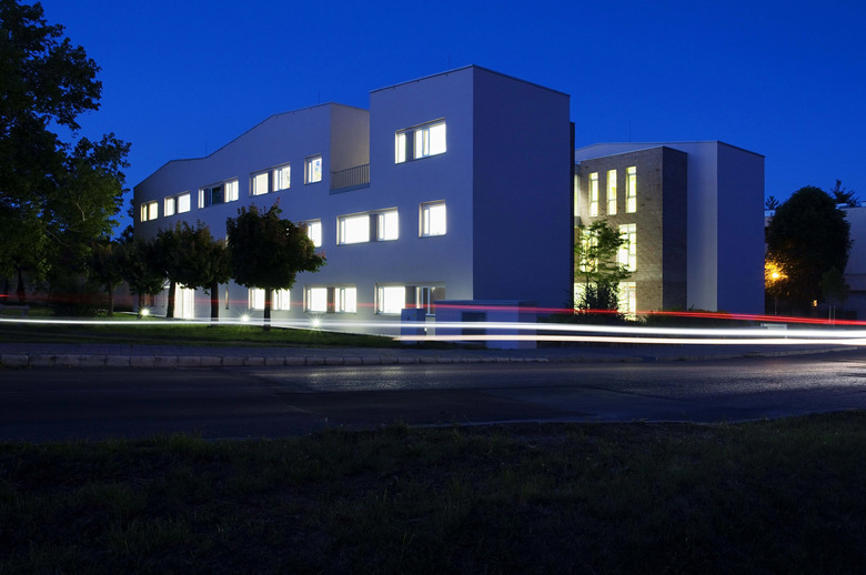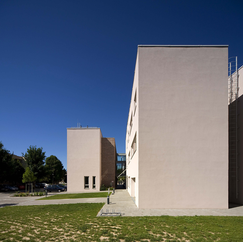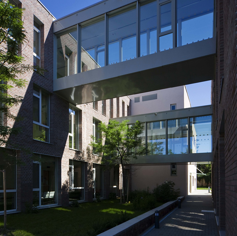 The function required nearly the same sized rooms that could be divided, in the aspect of use, into three bigger units. This also justified the functionally and the formation of the three separated blocks. The biggest volume on the side of the park houses the general practice clinics on the ground floor; this is the main entrance of the building. In the middle mass the medical service can be found on the ground floor and the offices and training rooms on the first and second floors, while the child care is located in the third block. All of the units have separated entrances so they can be used independently.